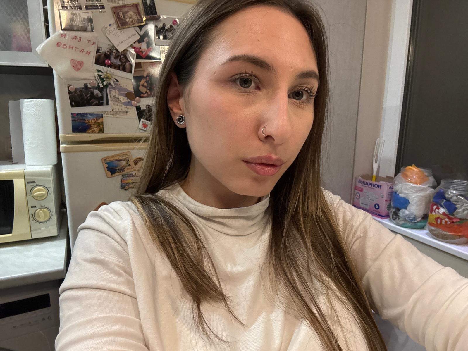 A woman is in a kitchen. The background includes a refrigerator covered with magnets and photographs, a microwave, and a window sill with containers. The woman has long brown hair, fair skin, and a no…read more
