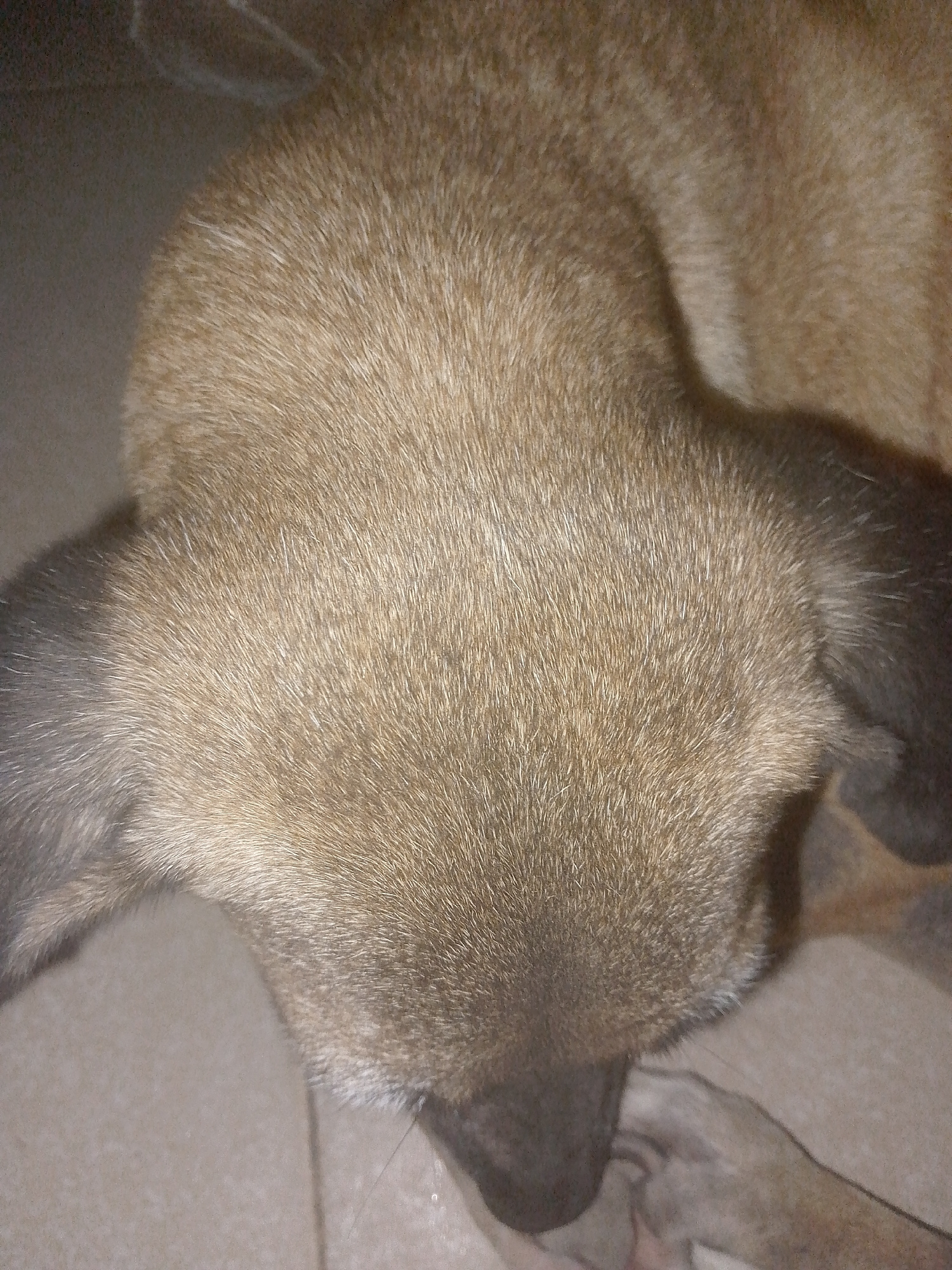A close-up shot focuses on the head and upper body of a brown dog. The dog has short, dense fur, and its ears are floppy with darker fur. The dog's nose is dark, and it appears to be resting its head…read more