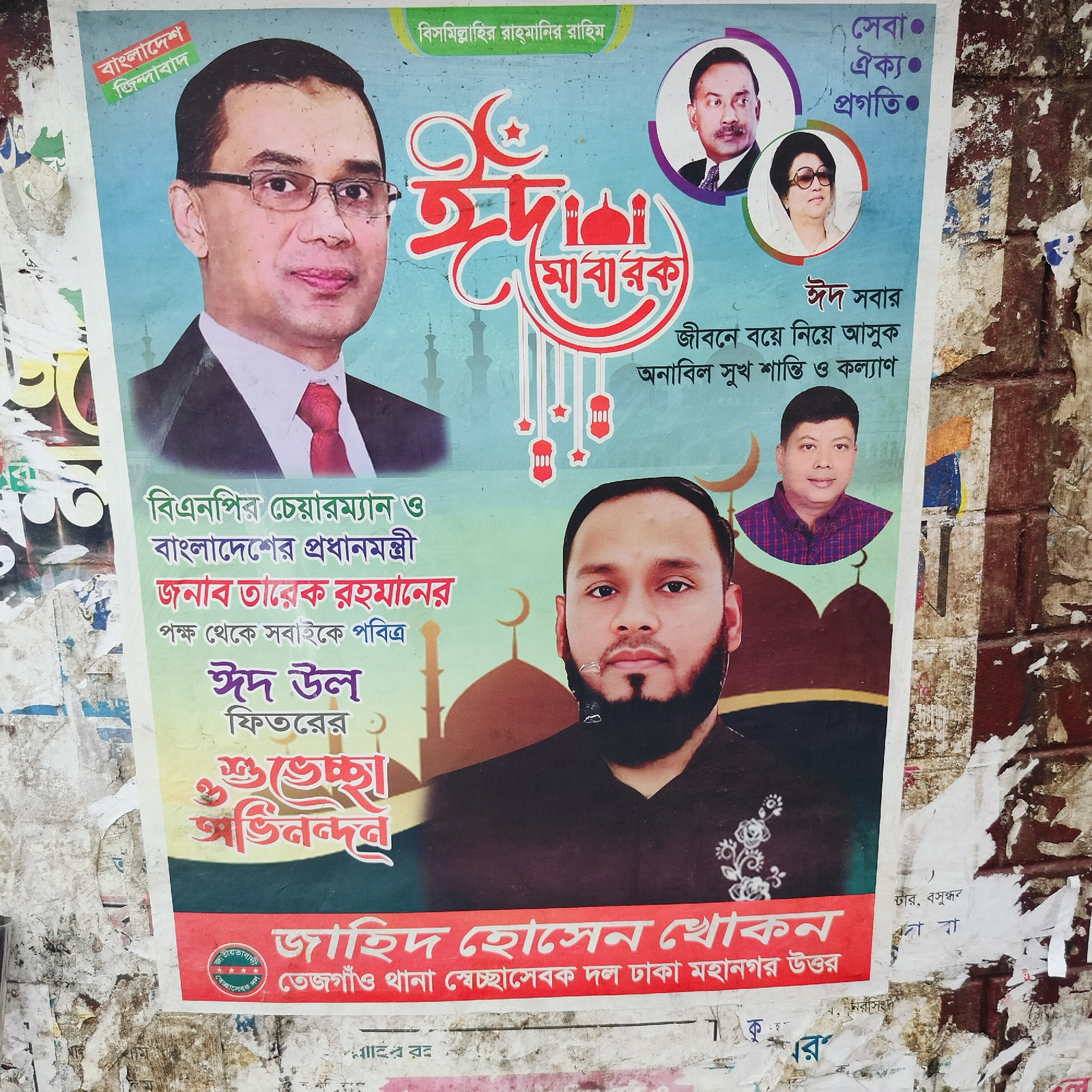 This is a photograph of a political poster for Eid ul-Fitr, posted on a wall in Dhaka, Bangladesh. The poster features portraits of several political figures, including two men wearing suits at the to…read more