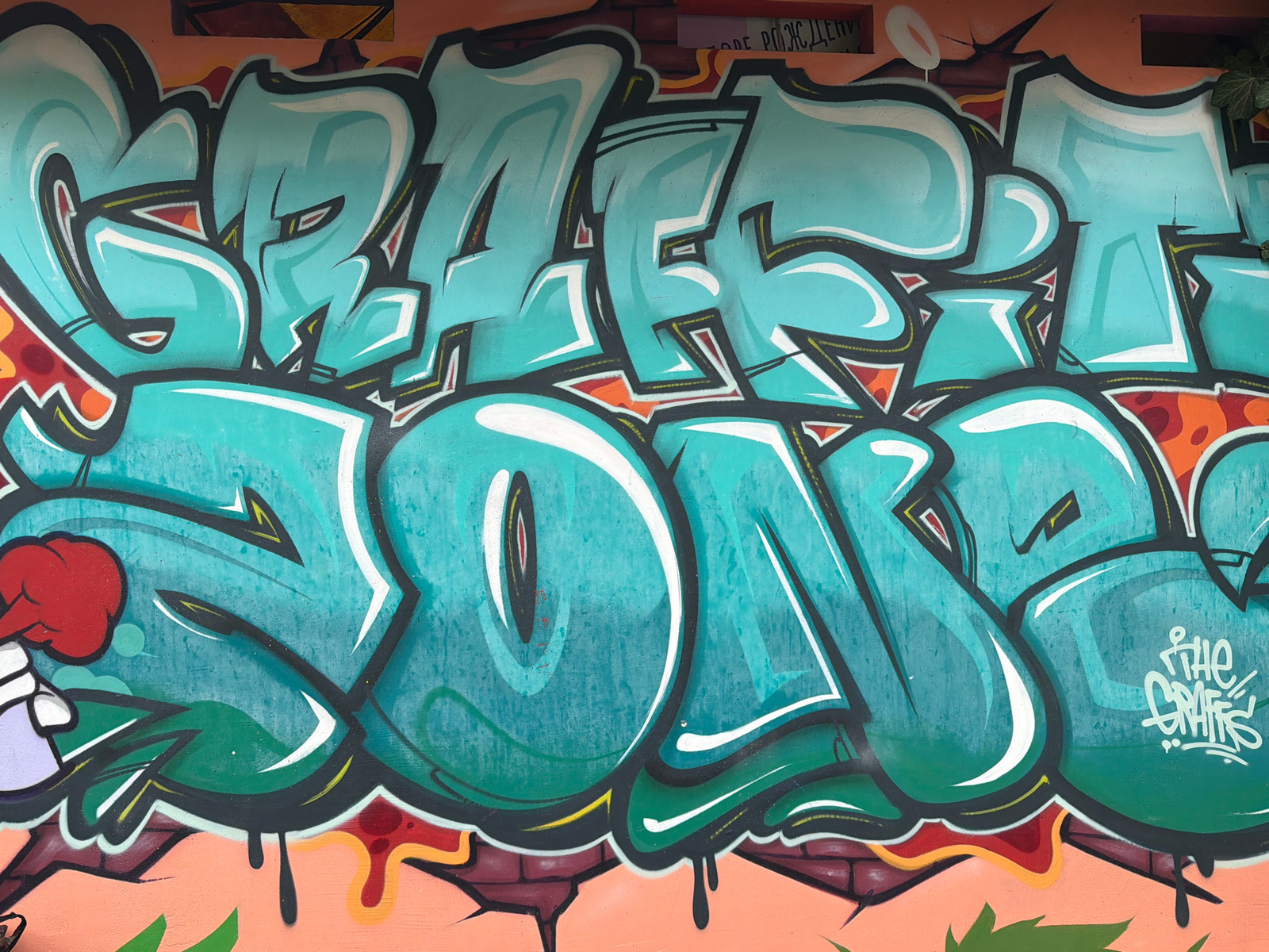 A color photograph shows graffiti on a wall. The graffiti is in a teal color, with dark green, white, black, orange, and red accents. The word "GRAFF SOA" is written across the center of the image. Th…read more