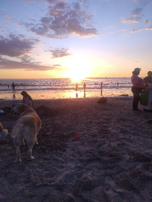 A sunset scene at a beach. The sun casts a bright glow on the water and sky, which is filled with orange, yellow, and blue hues. Silhouetted figures stand near the water's edge. A light brown dog lies…read more