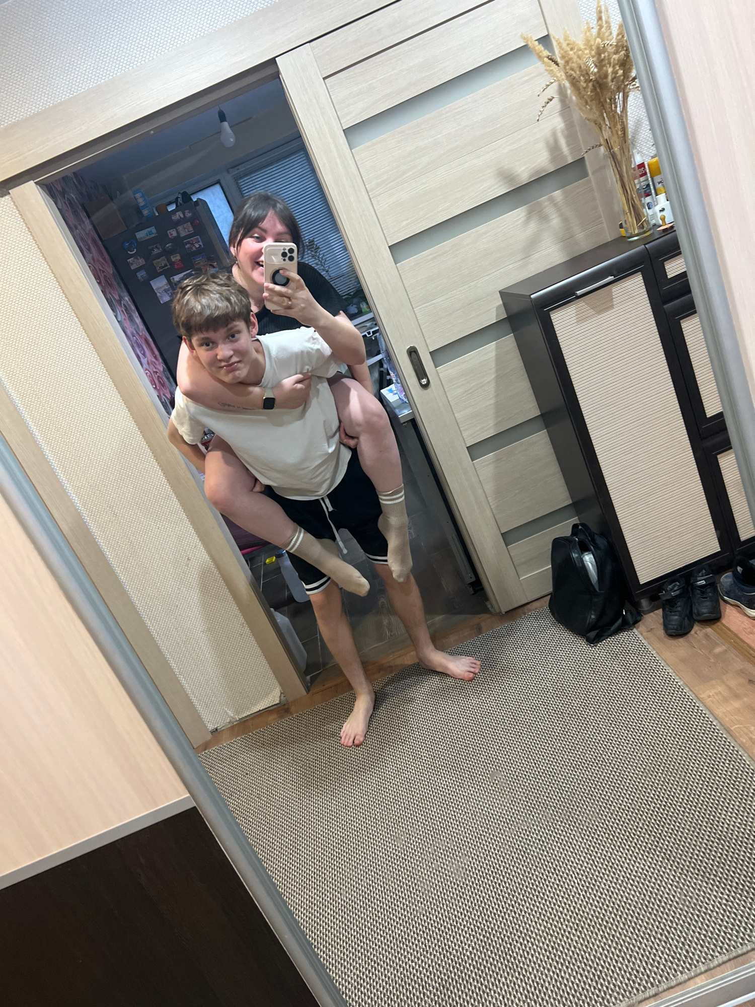 The image captures a mirror reflection of an indoor domestic scene. Two individuals are present: a female, visible from the chest up, with dark hair, smiling and holding a light-colored smartphone to…read more