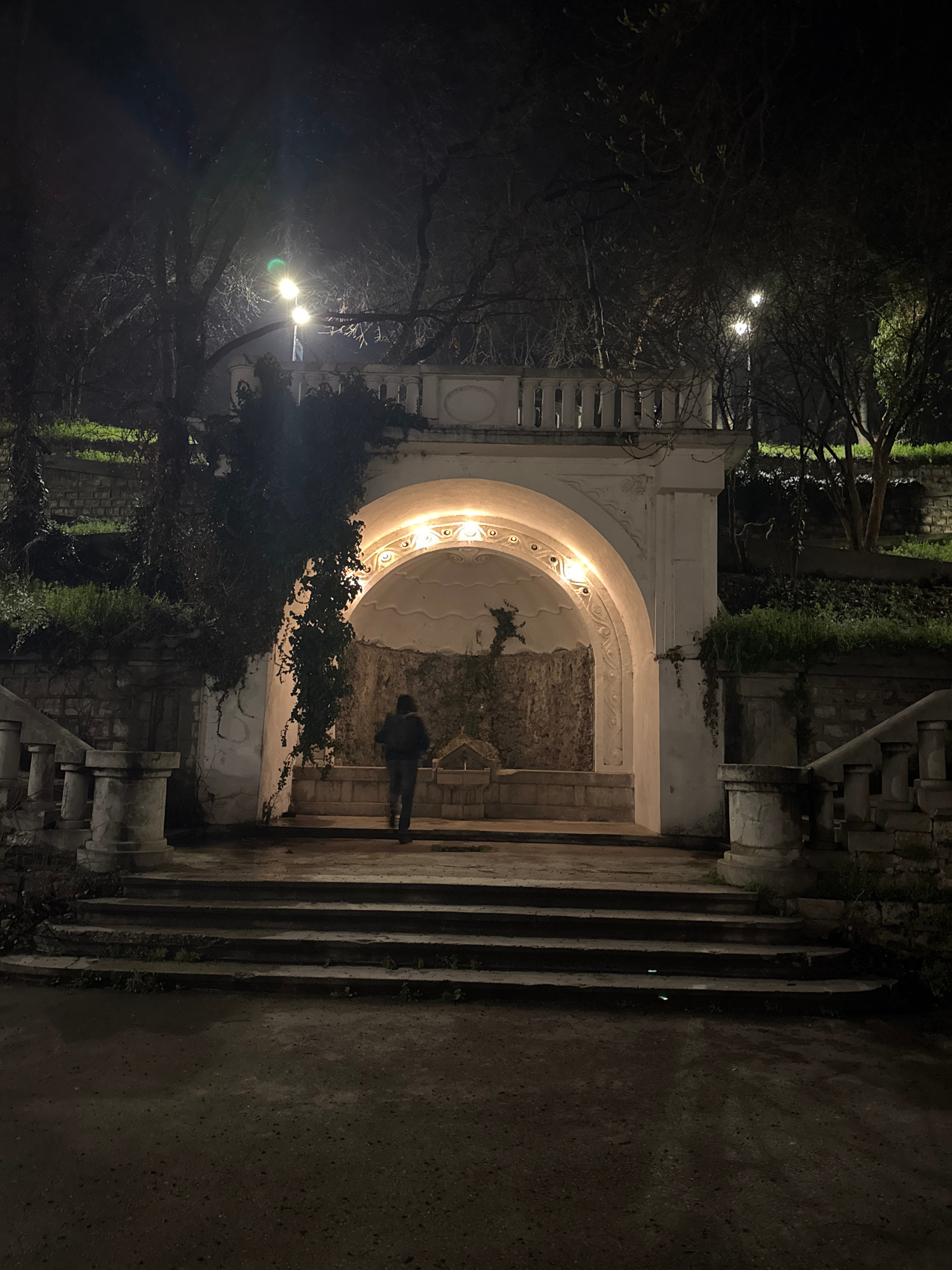 At night, an illuminated architectural feature in Varna, Bulgaria, dominates the scene. The feature has an arched entrance with decorative moldings and intricate carvings. A dark-clothed person stands…read more