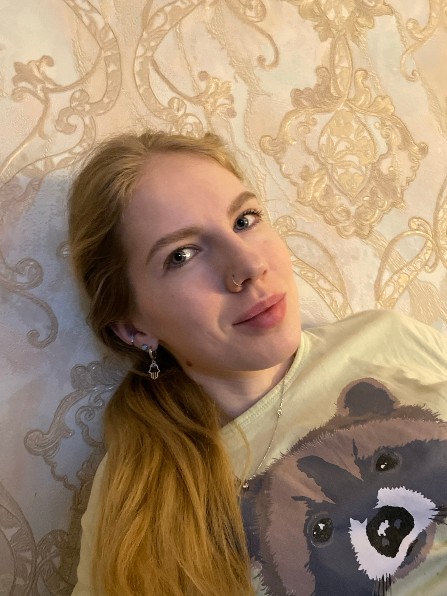 A young woman is lying on her back on a patterned surface. She has light skin, blond hair, and is wearing a t-shirt with a cartoon bear image. She has a nose ring and earrings shaped like hands. The b…read more