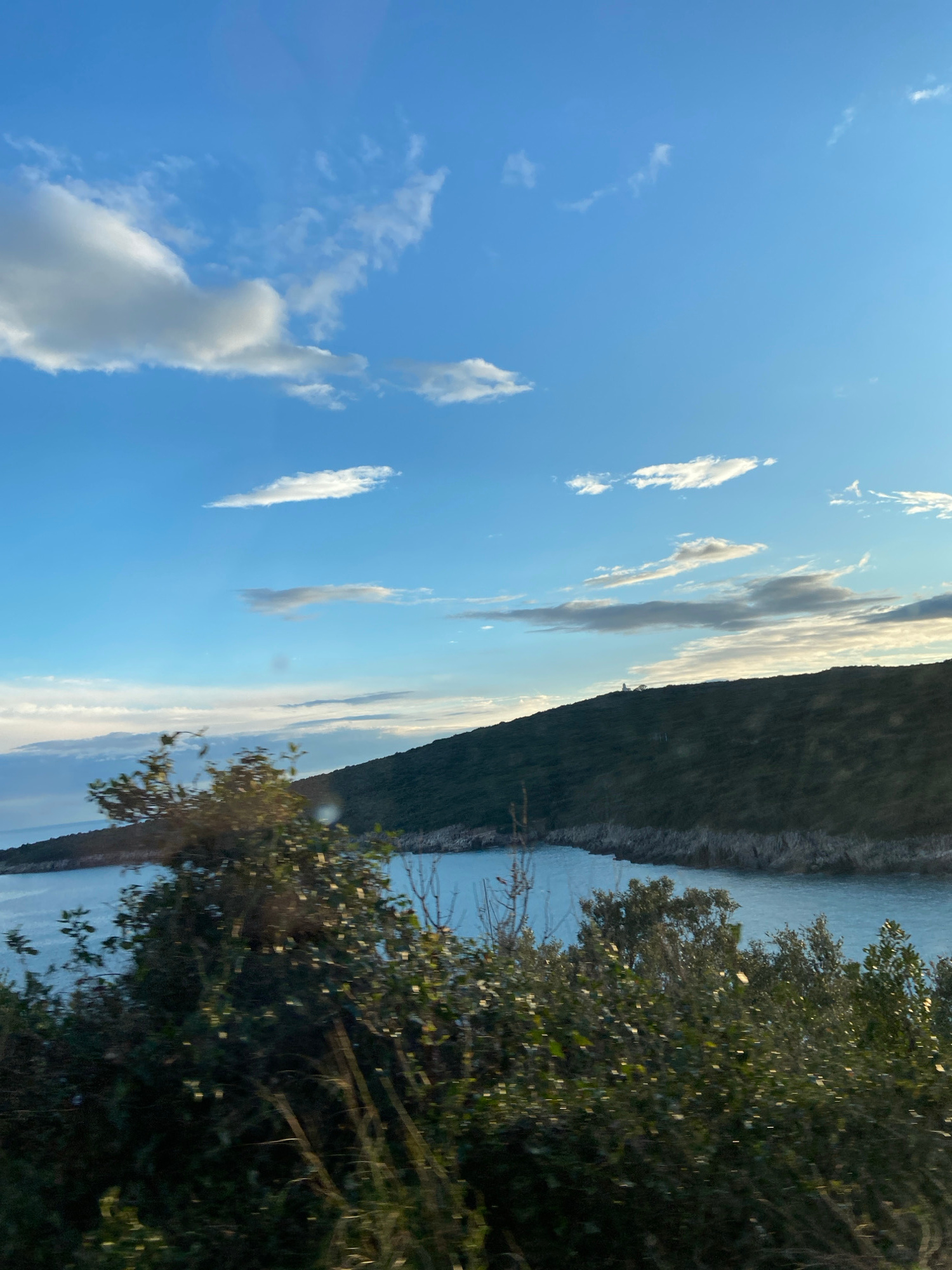 The image shows a daytime landscape scene in Dubraljevina, Montenegro. The sky is blue with scattered white clouds. A dark green, steep hillside extends diagonally across the image. Adjacent to the hi…read more