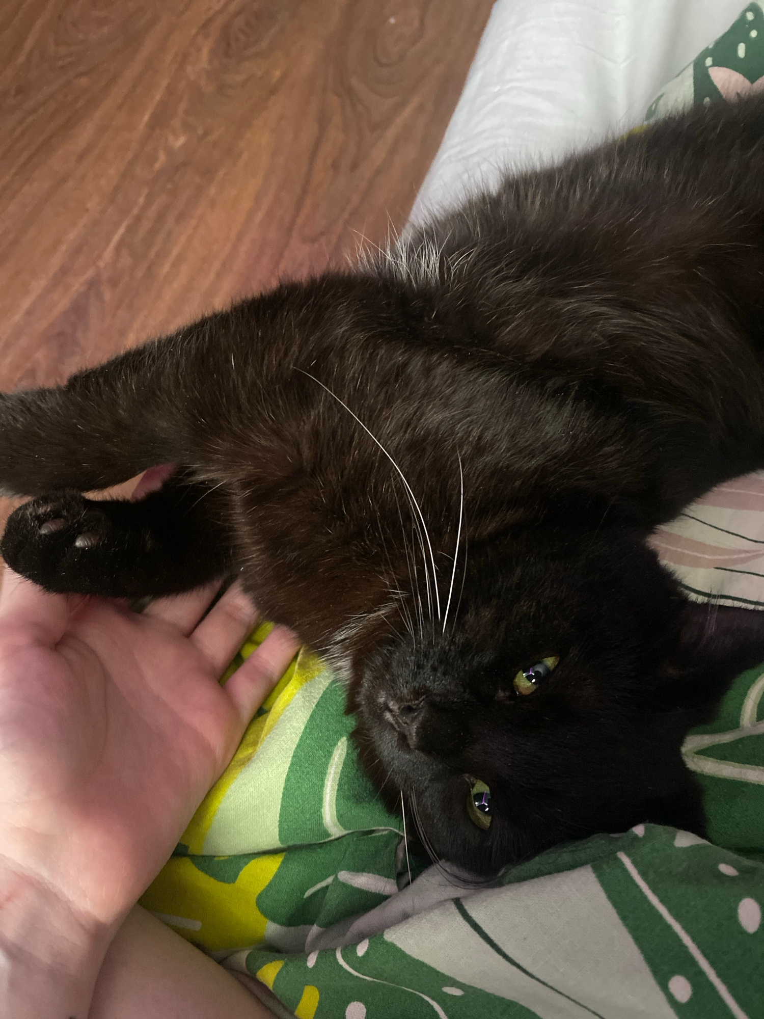 A black cat is lying on a patterned surface, possibly bedding, with its paw resting on a human hand. The cat has green eyes and some white whiskers. The bedding has a green and yellow pattern. The cat…read more
