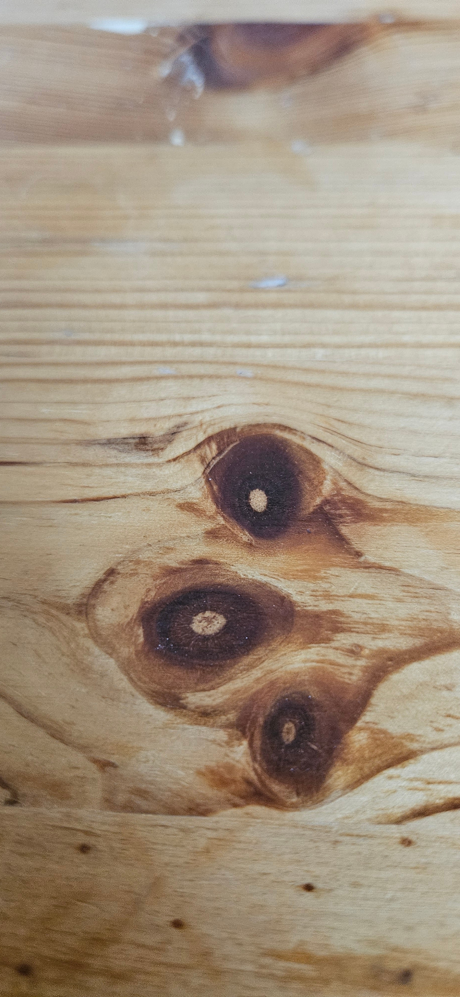 The image shows a close-up of a wooden surface, likely a piece of lumber or plywood. The wood grain is prominent and exhibits various shades of light brown and tan. A distinctive knot feature is centr…read more