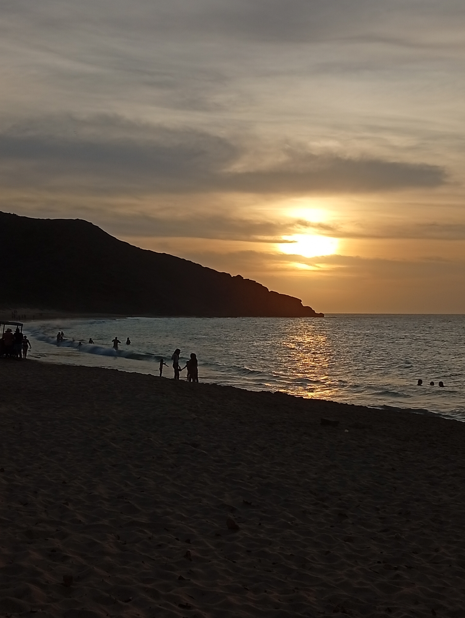 The image shows a sunset scene at a beach. The sun is partially obscured by clouds, casting a golden light across the water. A large, dark hill or mountain is present in the background, extending into…read more