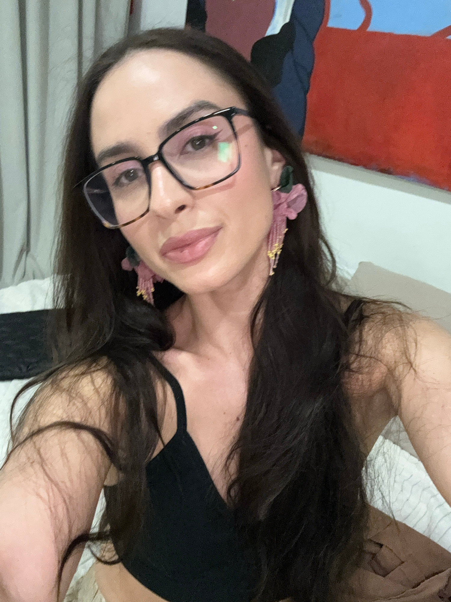 A young woman with long, dark hair is captured in a selfie indoors, located in Krasnoyarsk, Russia. She wears black-rimmed glasses and a black top or bra. Notable accessories include large, pink or pu…read more