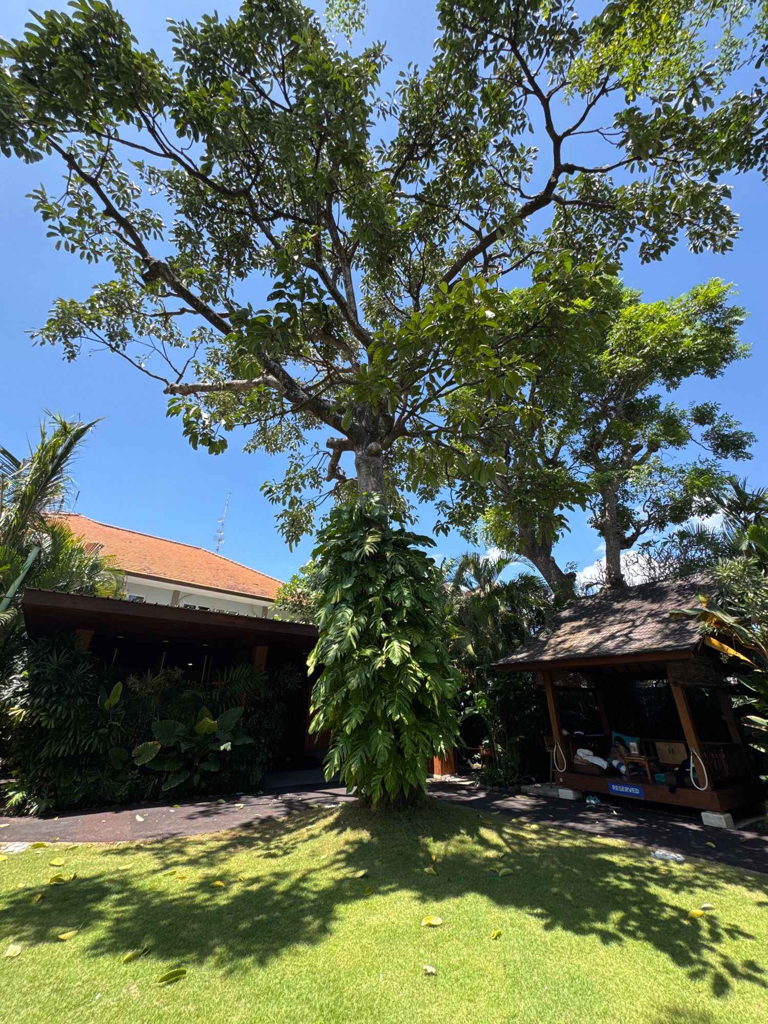 The image depicts a sunny outdoor scene in Kuta, Indonesia. A large tree with lush green leaves dominates the left side of the frame, its branches reaching towards a clear blue sky. To the right, ther…read more