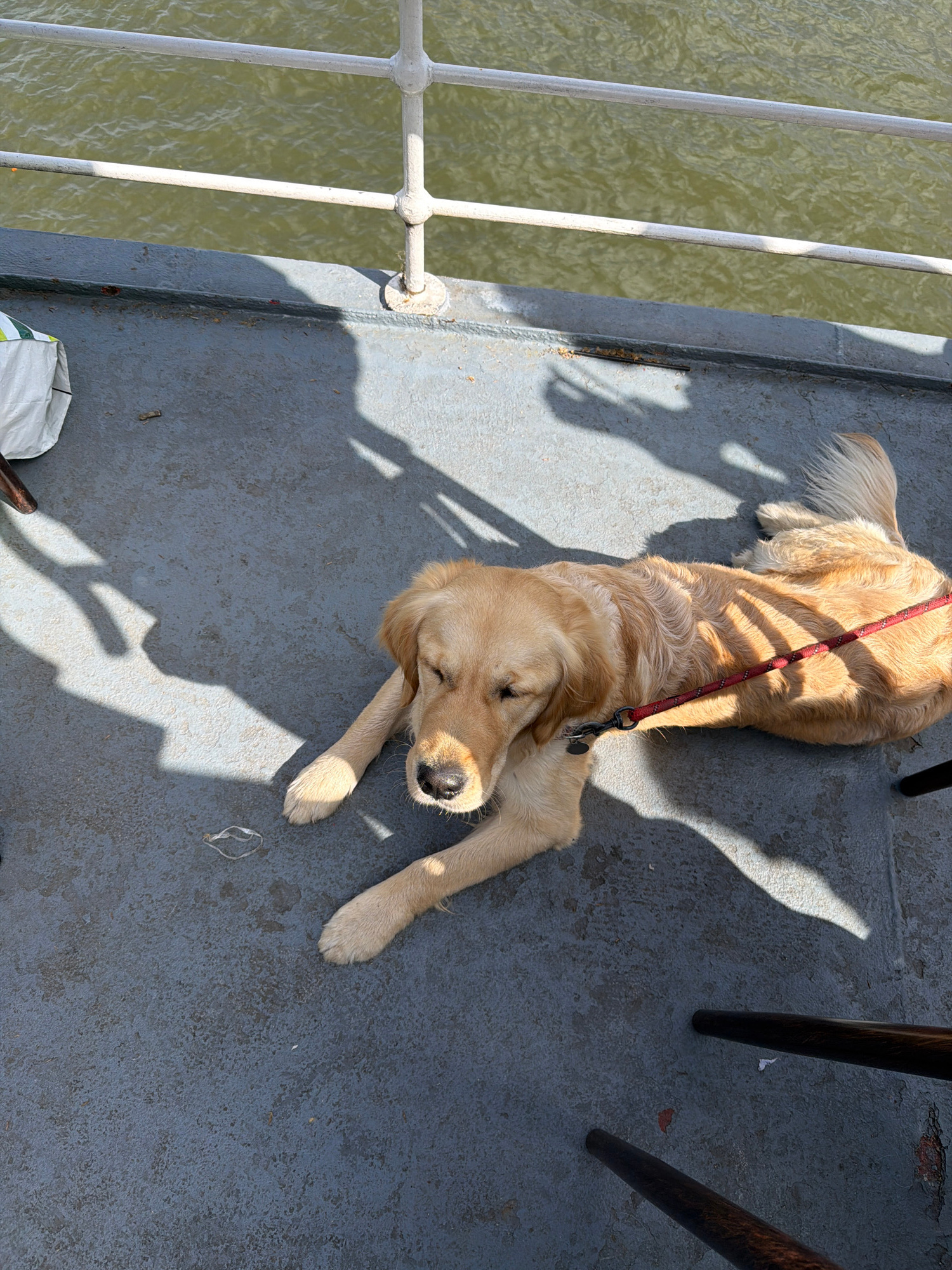 A golden retriever lies on its side on a gray, textured surface next to a white railing and a body of water. The dog has a red leash attached to its collar. Shadows cast by nearby objects and sunlight…read more