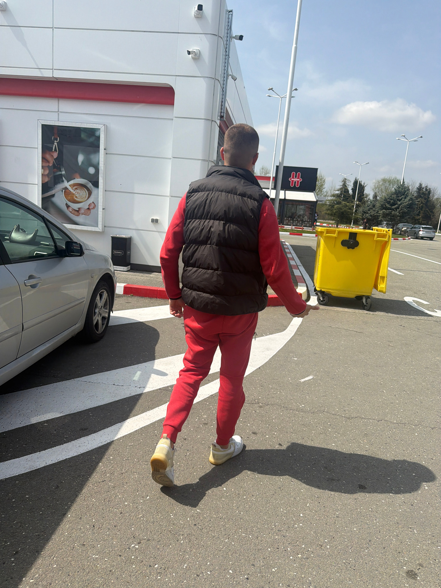 A medium shot, taken at an angle, depicts a man standing in a parking lot next to a car and a yellow trash bin. The man wears a red tracksuit and a black vest. He stands on a white-striped crosswalk.…read more