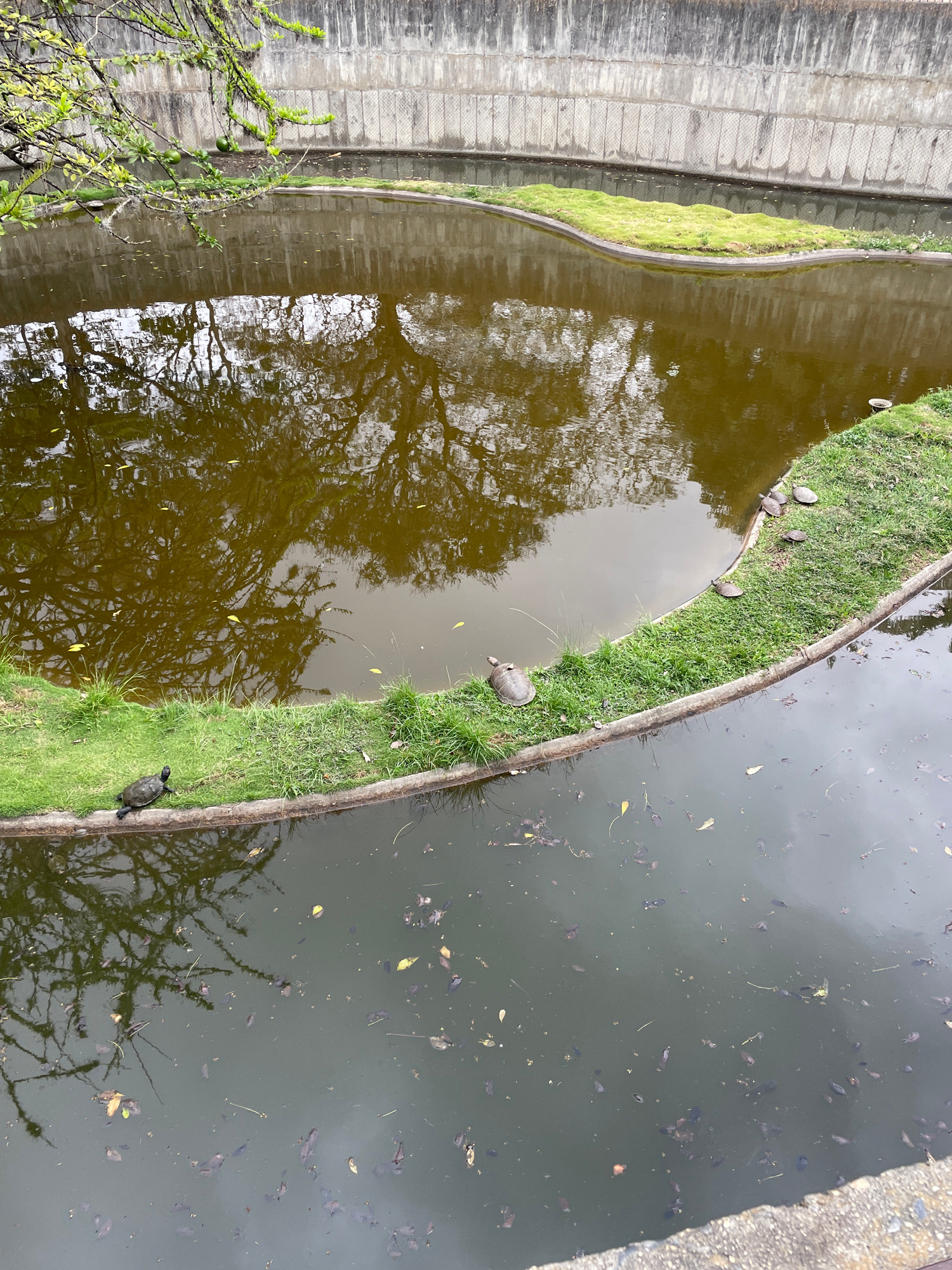 This image captures an animal enclosure within a park or zoo in Caracas, Venezuela, featuring a large pond with a central, grassy land strip. The pond's water is murky, exhibiting a brownish-green hue…read more