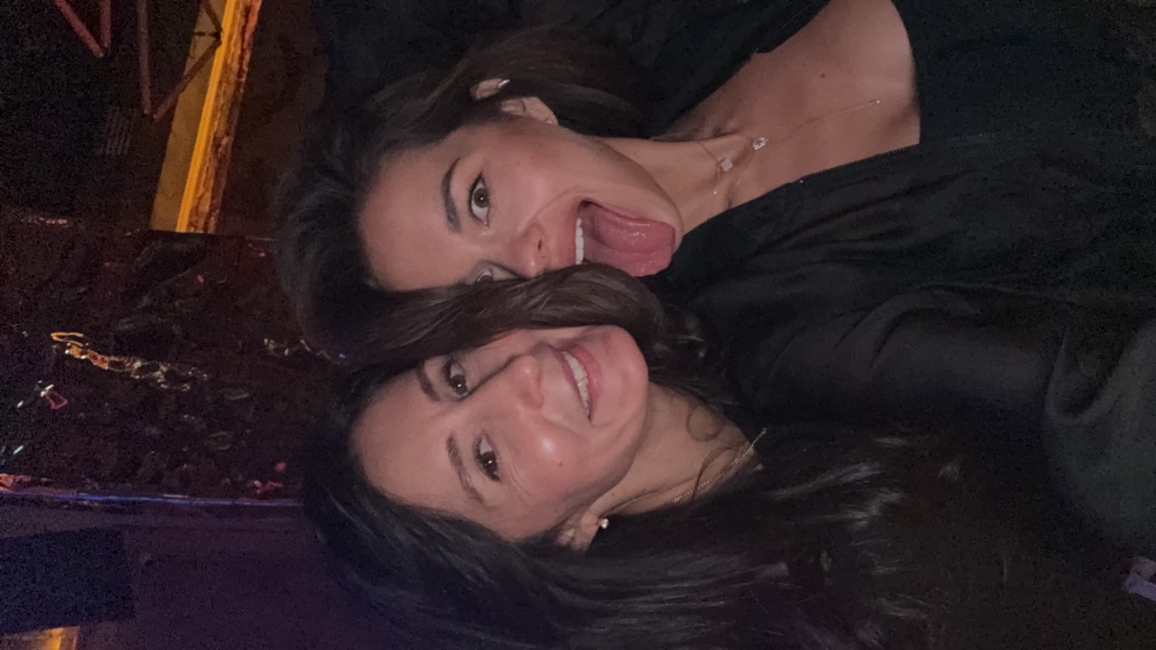 Two women stand close to one another in a dimly lit nightclub. Both are wearing dark tops. The woman on the left has long dark hair, and wears a black shirt and black and white patterned belt. The wom…read more