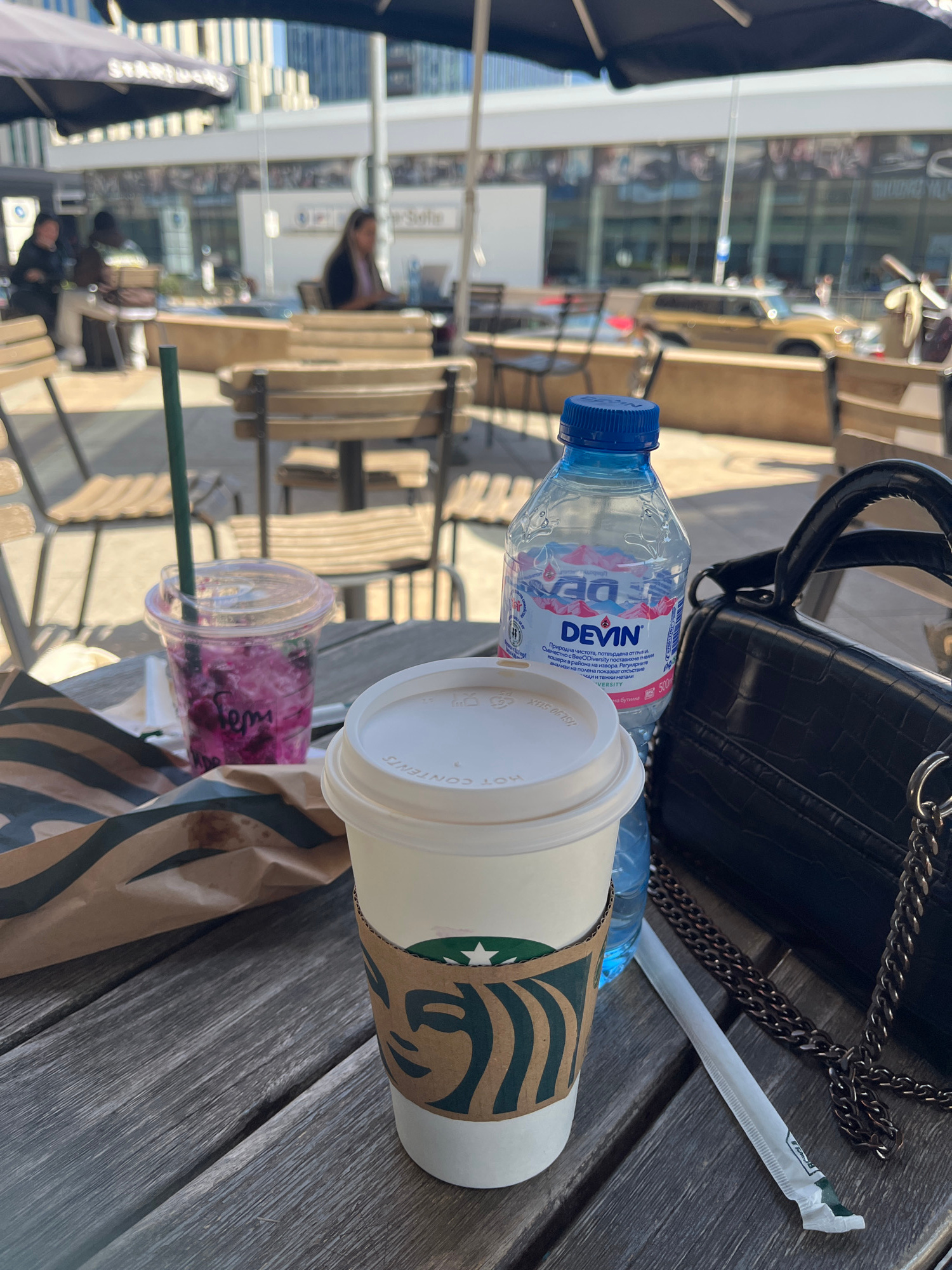 The image captures an outdoor cafe setting in Sofia, Bulgaria, during what appears to be a bright, sunny day. The scene is viewed from an elevated perspective, looking down at a wooden slatted table l…read more