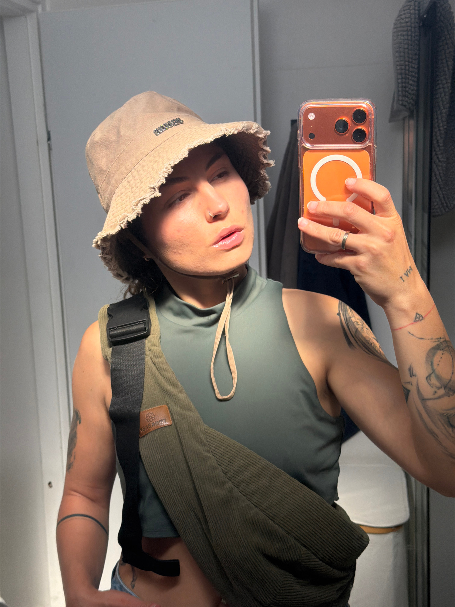 A person is taking a selfie with a phone in a room, possibly indoors, considering the presence of a wall and shelf. The person is wearing a beige bucket hat and a dark green tank top. The phone is in…read more