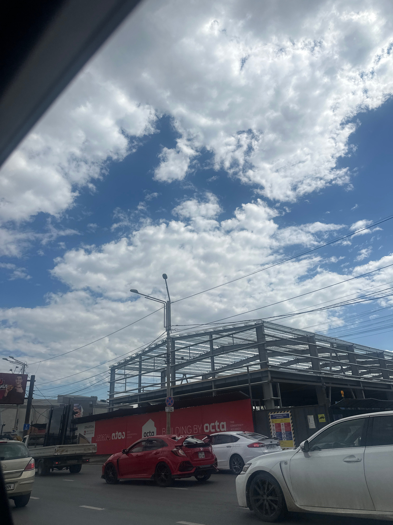 The image shows a street scene in Tbilisi, Georgia, with a partially constructed building on the right. A red banner with the word "octa" written on it hangs on the construction site. Several cars are…read more