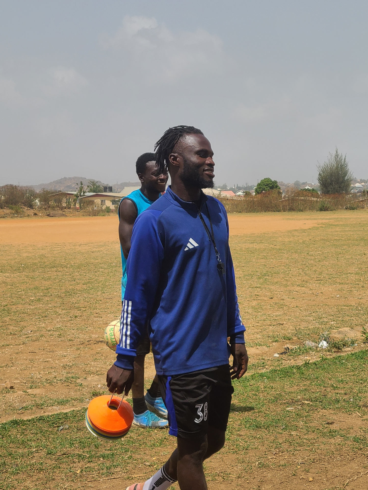 Two Black African men stand on a dirt and grass field in Barikin Jirga Summa, Nigeria. One man, wearing a blue long-sleeved shirt and black shorts with the number "38" on them, holds a stack of orange…read more