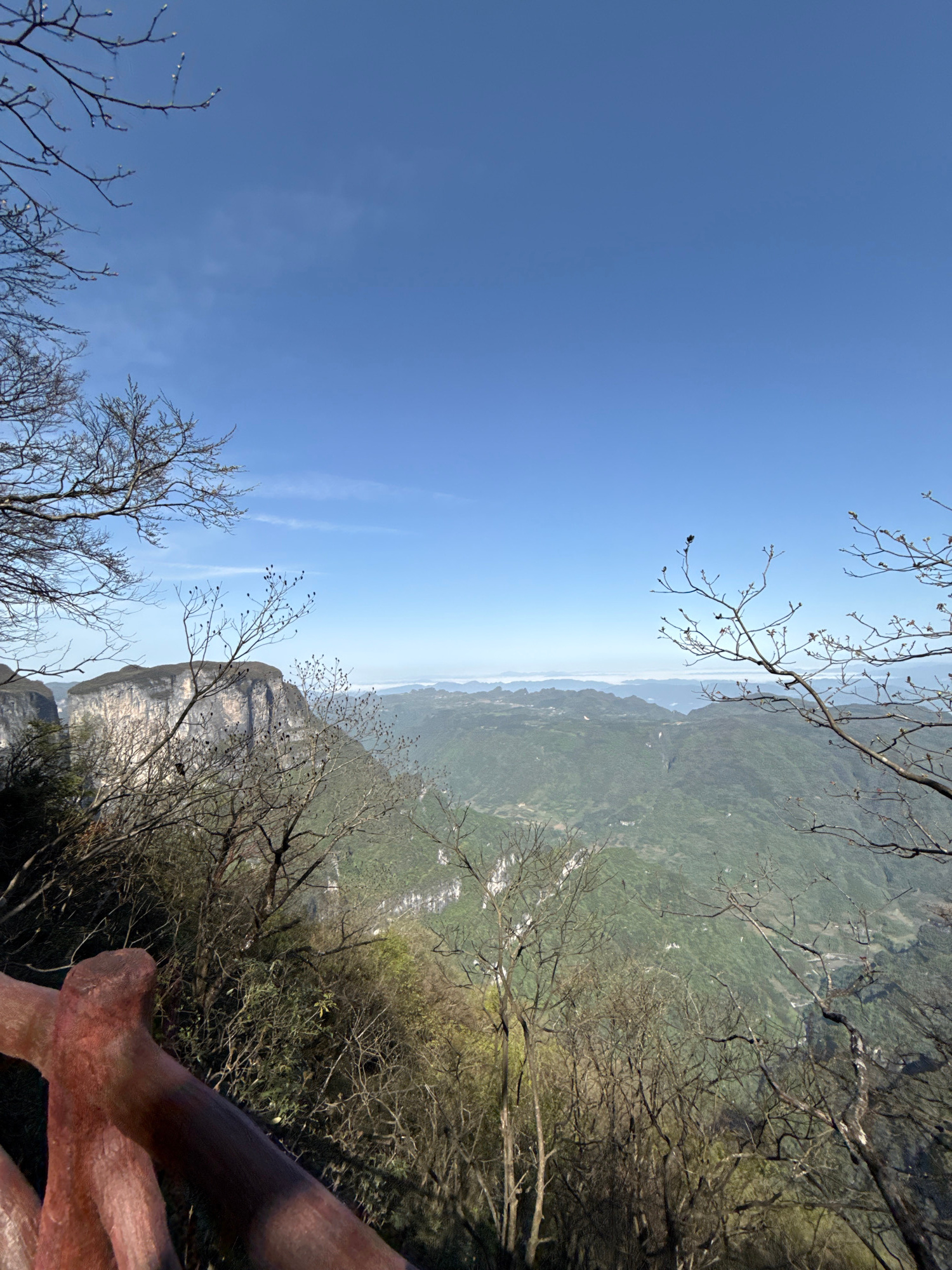 A landscape photograph taken in Yongding District, China, shows a view from an elevated perspective. The sky is a gradient of light blue with wispy clouds. Below, a valley is visible, covered in green…read more