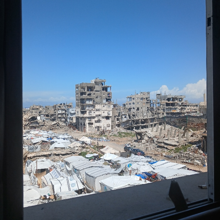 This image, captured from an elevated perspective framed by a window, depicts an extensively damaged urban landscape in the city of Gaza, Palestinian Territory. The scene is set under a clear blue sky…read more