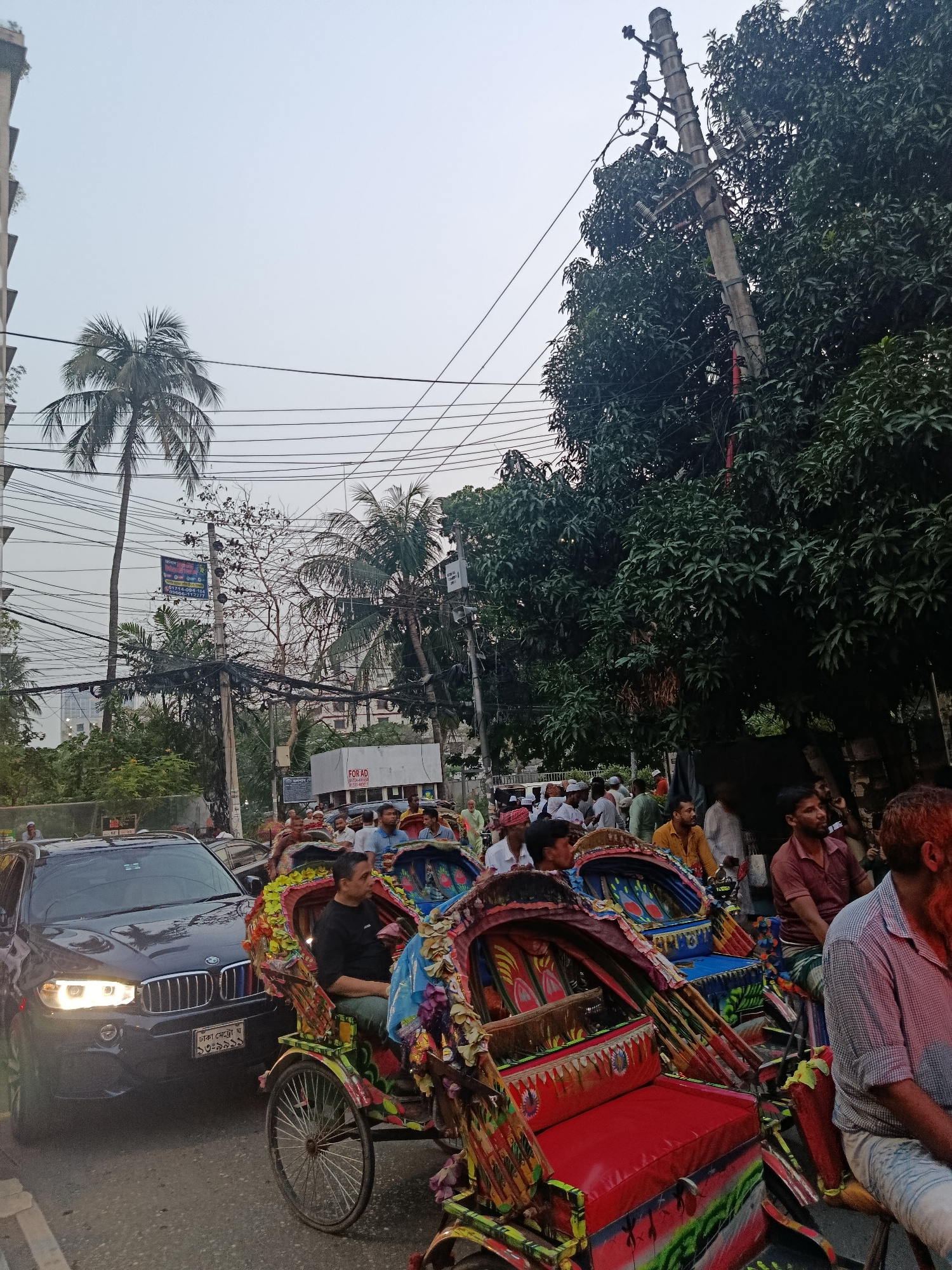 The image shows a crowded street scene in Dhaka, Bangladesh. Several brightly decorated cycle rickshaws, each carrying a passenger, are in the foreground. A black BMW SUV is visible to the left, its headlights on. A dense crowd of people, primarily men, are walking or standing along the street. Buildings and trees line the street, with power lines running overhead. The sky is overcast. | Open Wire