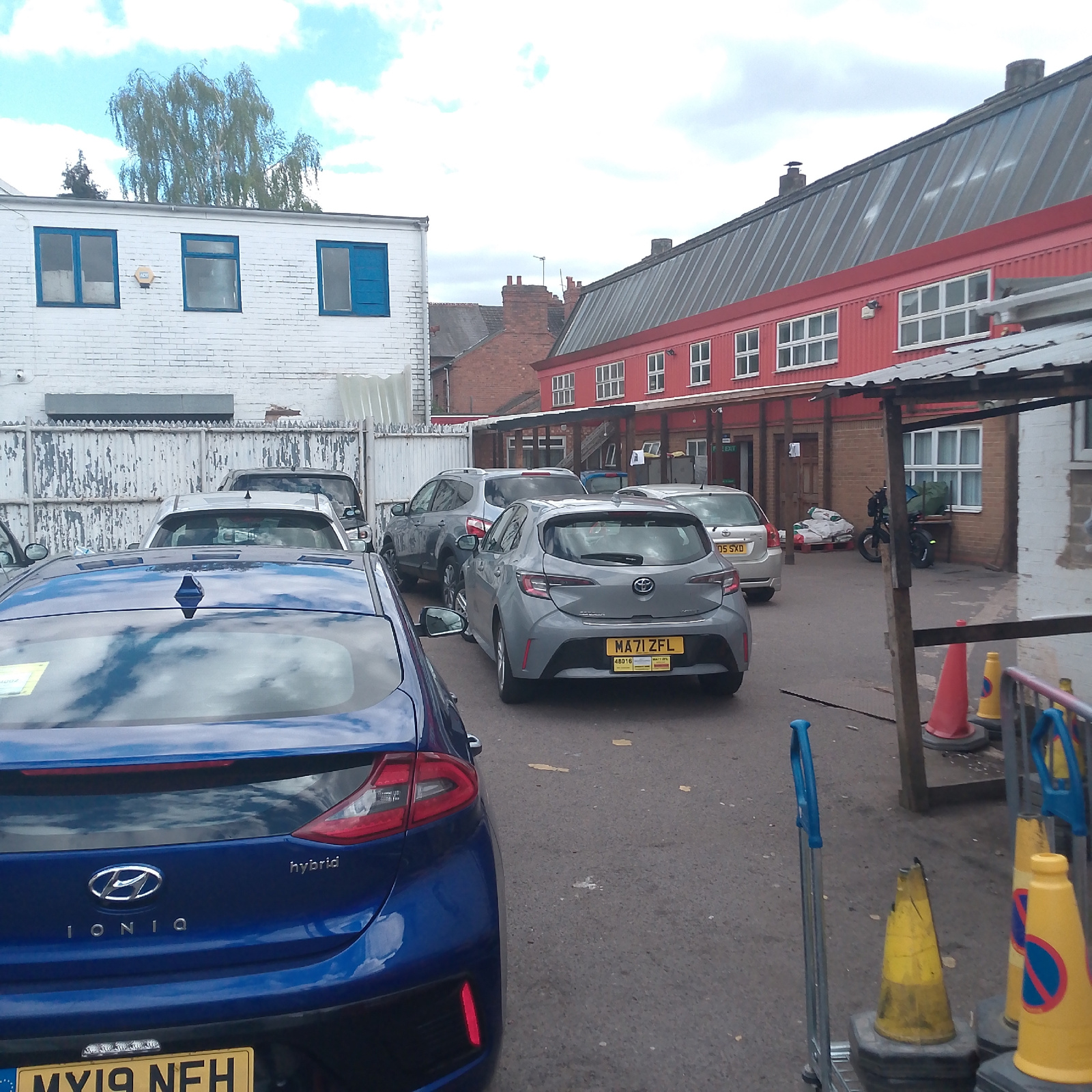 This daytime image, set in Coventry, United Kingdom, depicts a functional parking area or yard under a cloudy but bright sky. In the immediate foreground on the left, the rear of a blue Hyundai Ioniq…read more