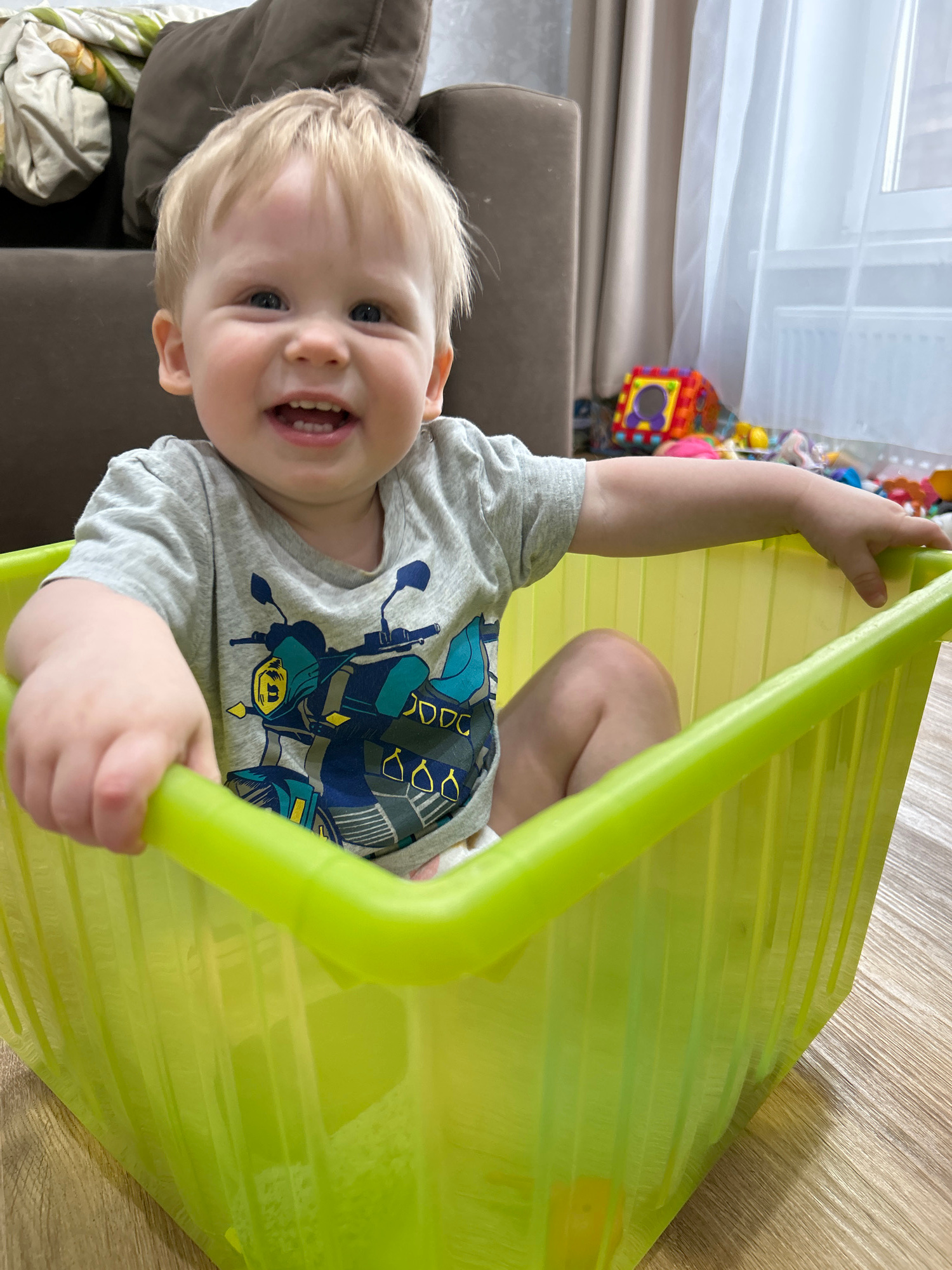 A young child with blonde hair and blue eyes sits inside a green plastic child's slide, indoors. The child wears a gray t-shirt with a motorcycle design. Part of a brown couch is visible to the left,…read more