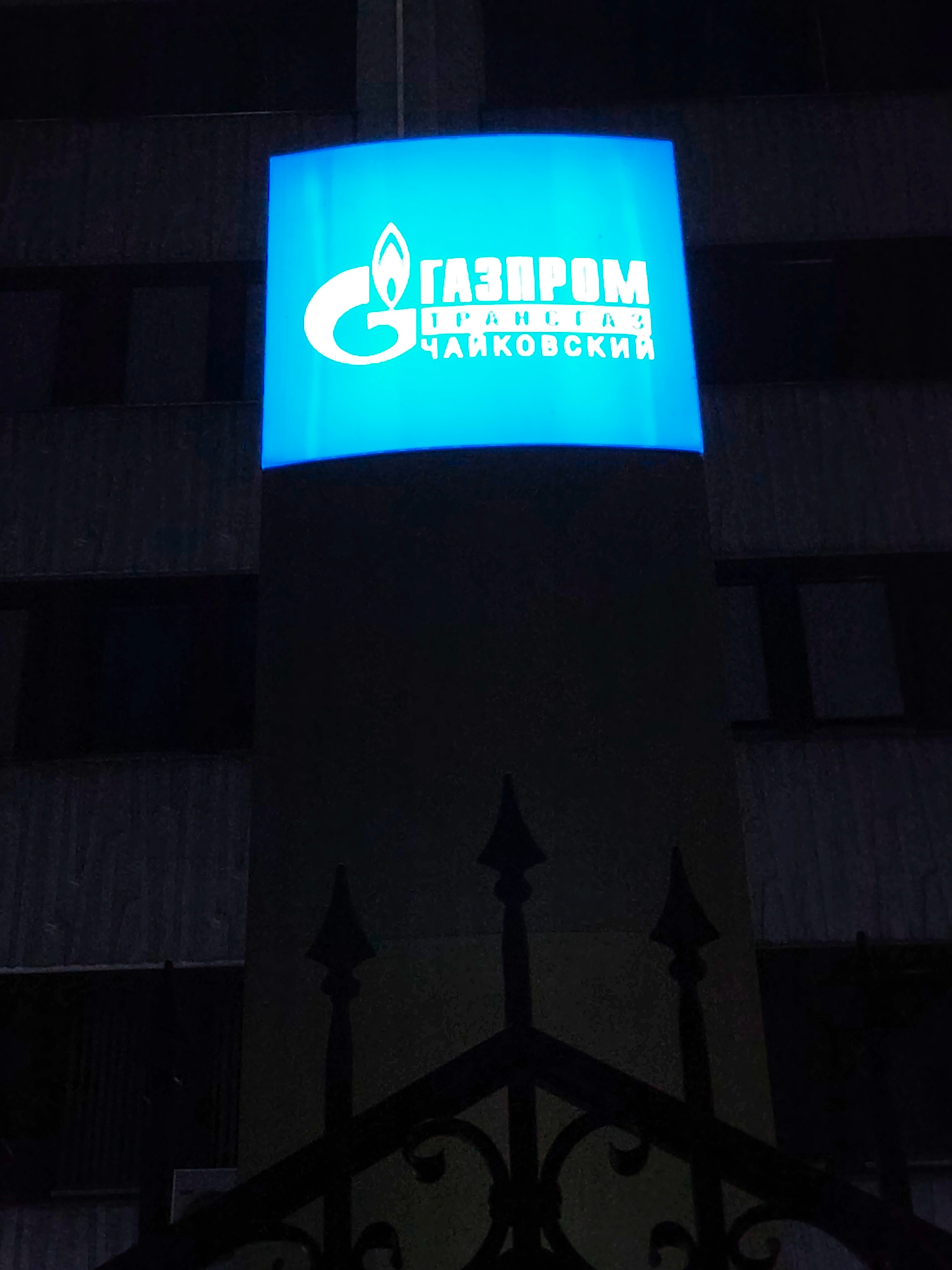A lit, blue Gazprom sign is attached to a building. The sign includes the Gazprom logo, the name "TRANSGAZ," and the city name "CHAIKOVSKY" in Russian. A dark, wrought-iron fence is visible in the for…read more