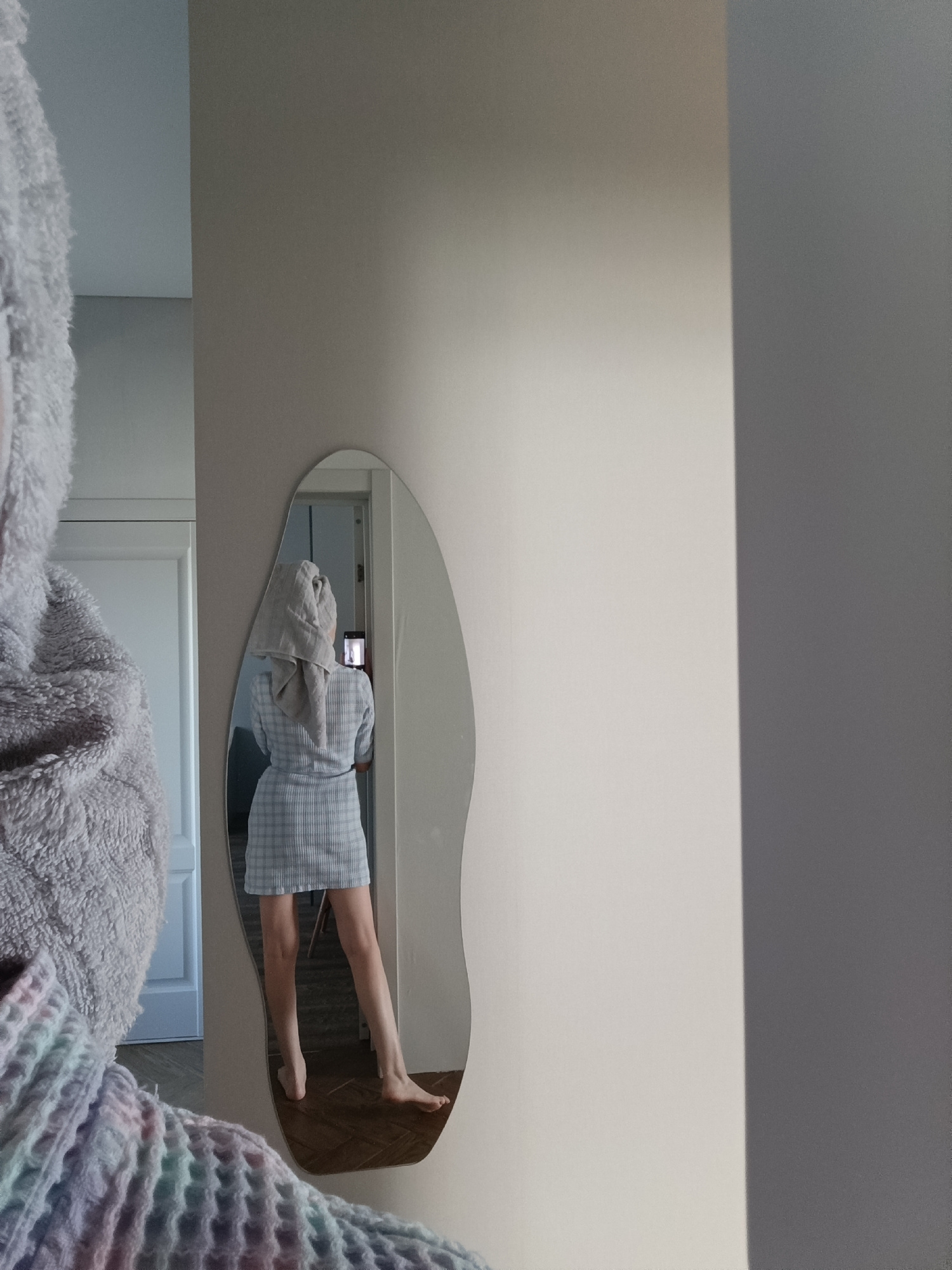 The image displays an indoor scene from a first-person perspective, capturing a mirror selfie. The photographer is partially visible on the left, out of focus, wearing a grey, plush-textured garment,…read more
