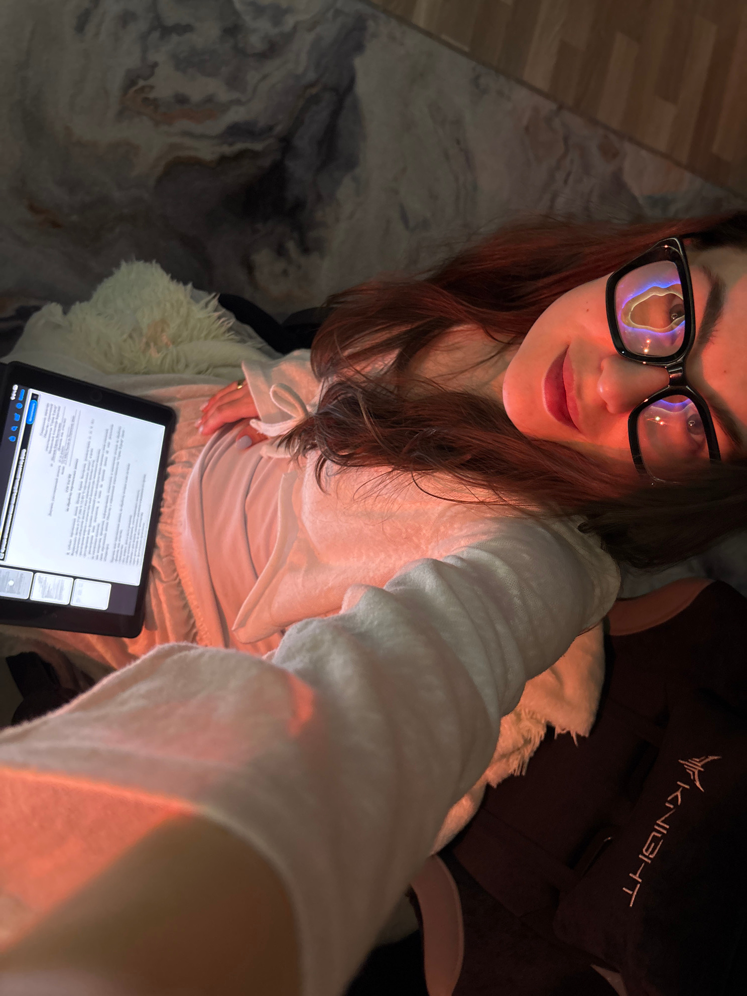A woman with long brown hair and wearing large black-framed glasses is taking a selfie. The reflection in her glasses suggests she is indoors, illuminated by a screen. She is wearing a light-colored,…read more