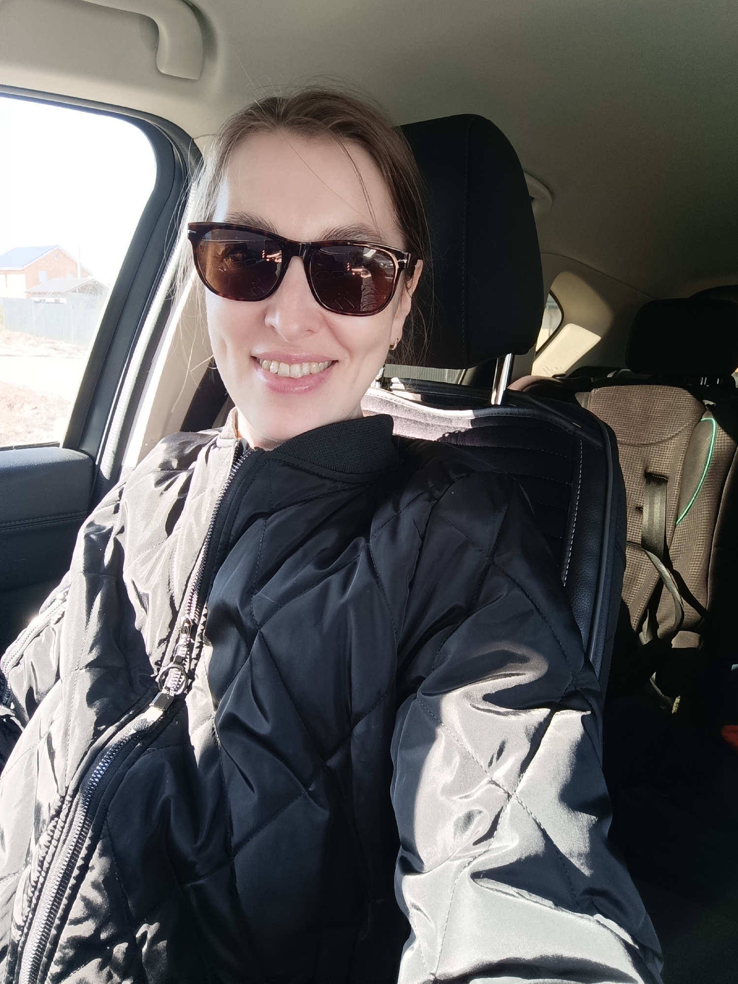 The image is a selfie taken by a woman inside a car, likely in Chaikovsky, Russia, based on the visible building in the background. She is wearing sunglasses and a black quilted jacket. She is smiling…read more