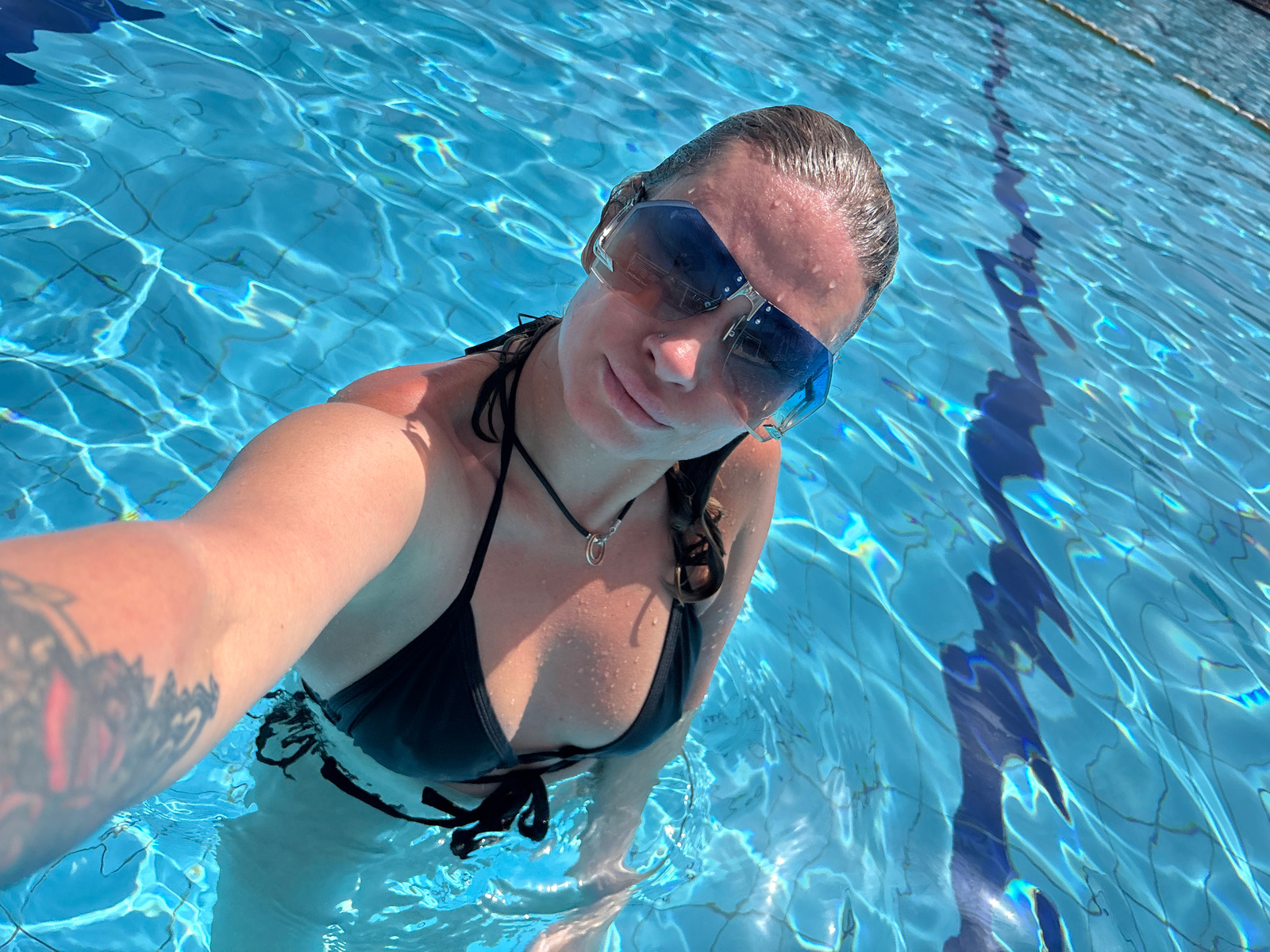 A woman is partially submerged in a swimming pool filled with clear, light-blue water. She is wearing a black bikini and blue-tinted sunglasses. Her hair is wet and slicked back. A tattoo is visible o…read more