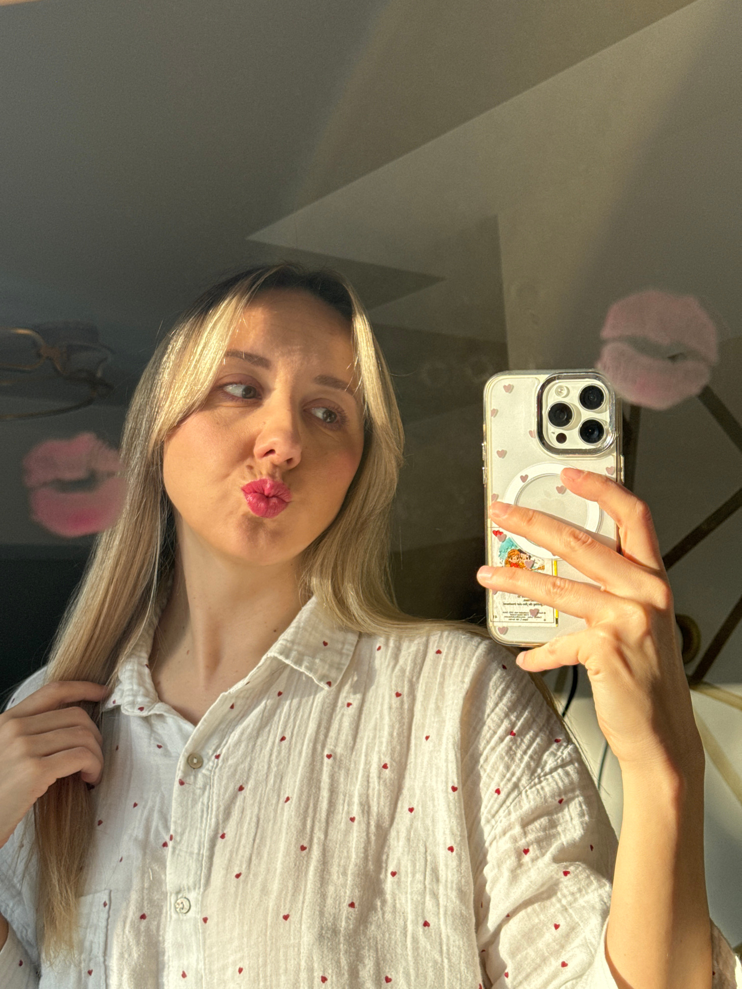 A woman is taking a selfie with an iPhone. The phone has a white case with small red heart details, and a cartoon image is affixed to the back. The woman has blonde hair and is wearing a white button-down shirt with small red hearts printed on it. She is pouting her lips for the photo. The background appears to be a dark, reflective surface, possibly a table or counter. In the reflection, there is a fuzzy pink object and a partial view of what appears to be a decorative brass object. There is strong sunlight in the scene. This image was not taken in Carnikava, Latvia. | Open Wire