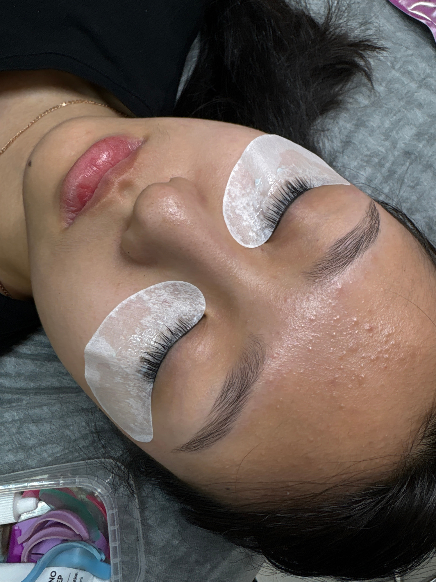 A close-up, top-down shot captures a woman lying on her back, eyes closed, in what appears to be a beauty salon setting. White patches are applied under her eyes, likely for an eyelash extension proce…read more