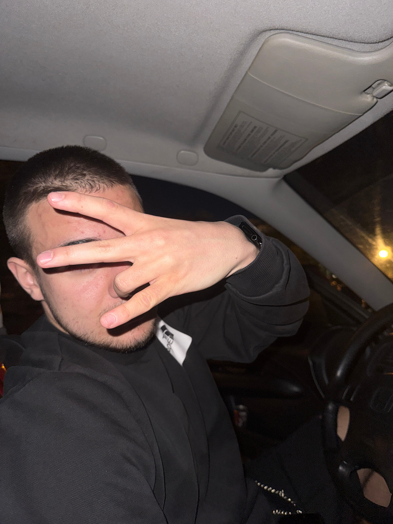 A person is inside a vehicle. The person is covering their face with a hand. The vehicle appears to be parked at night. It is not possible to determine a specific location within Plovdiv, Bulgaria.