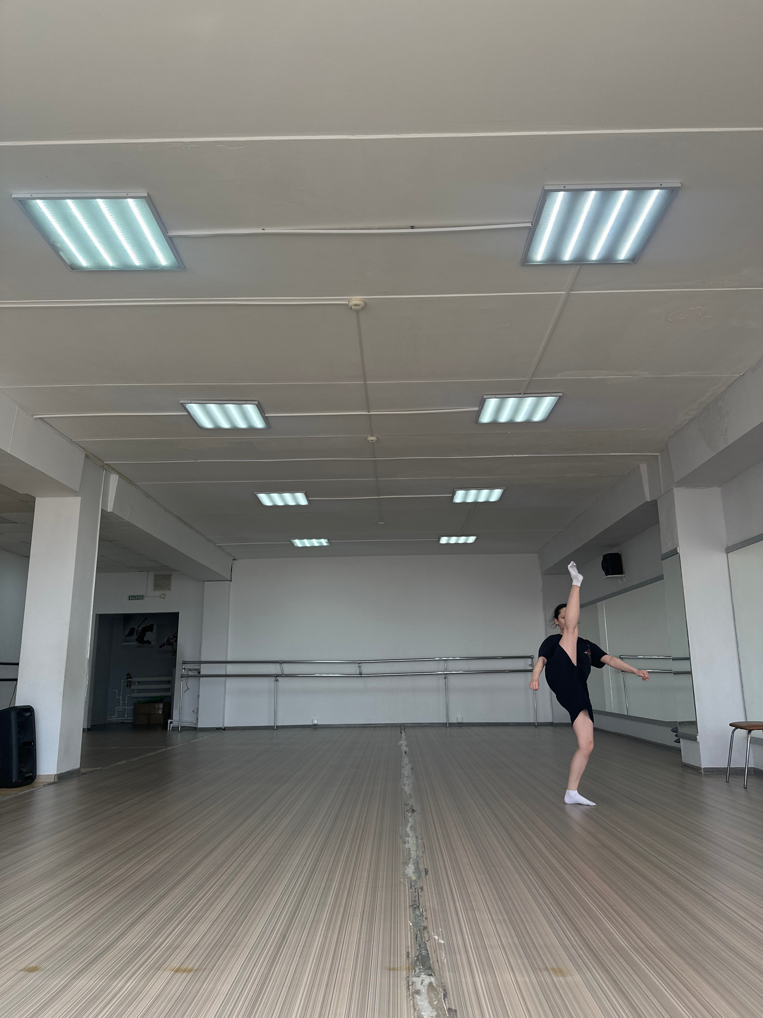 A person is in a room with a mirrored wall. The person is wearing black clothing and white socks. The location appears to be an athletic facility or dance studio with fluorescent lights on the ceiling…read more