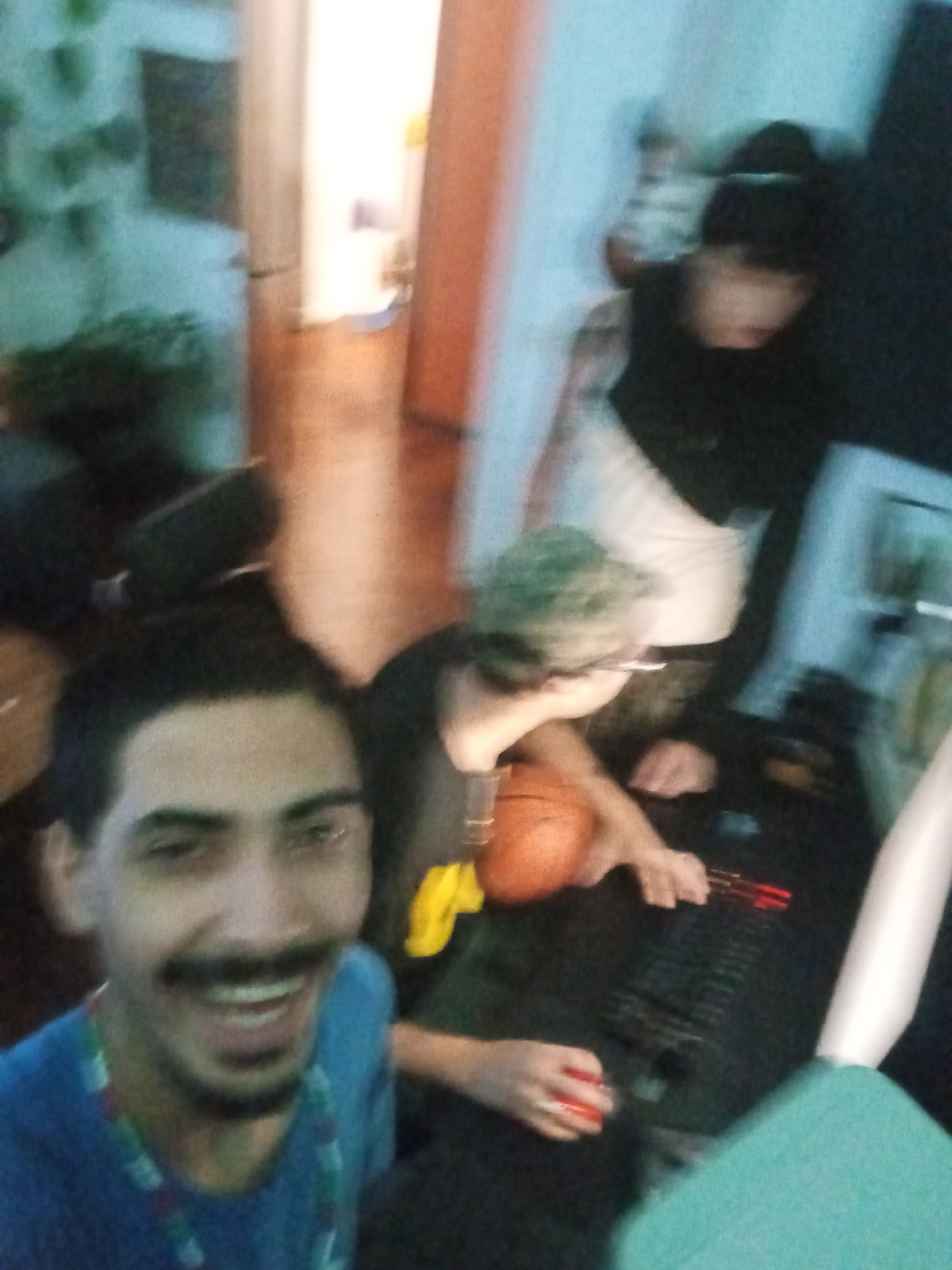 The image shows a blurry scene, possibly indoors, with multiple people present. One individual, likely male, is close to the camera, smiling and wearing a blue shirt. In the background, other people a…read more