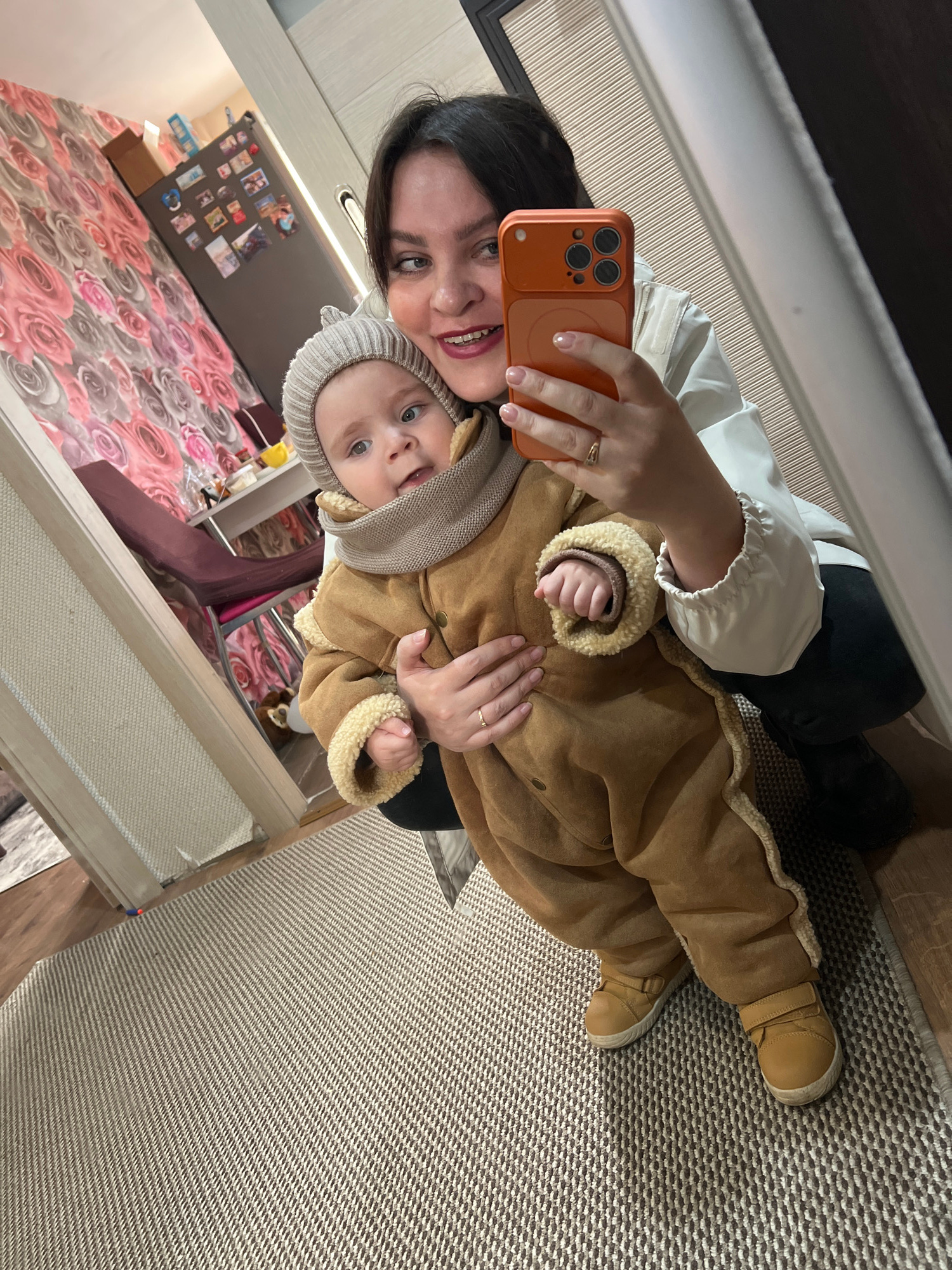 A woman is holding an infant, wearing a brown coat and hat, for a selfie. The phone being used is orange and has three rear-facing cameras. The woman has dark hair and is smiling. The background inclu…read more