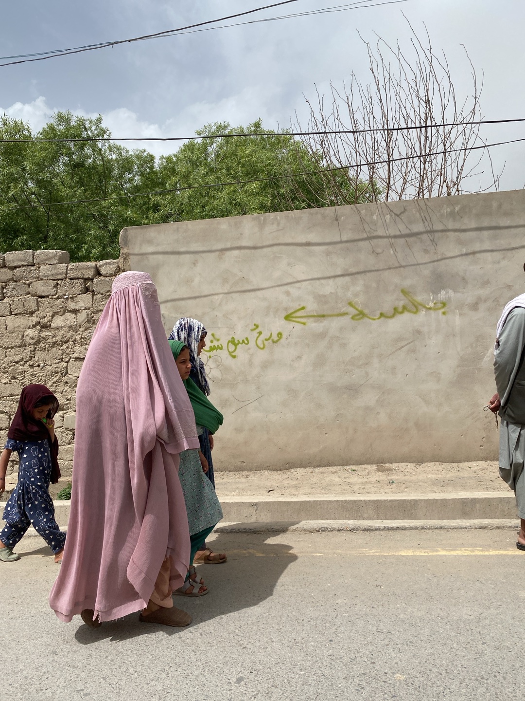 The image depicts a street scene in Kandahar, Afghanistan. A group of women and a young child are walking along a paved road. The woman at the forefront is wearing a full-body, light pink burqa. Besid…read more