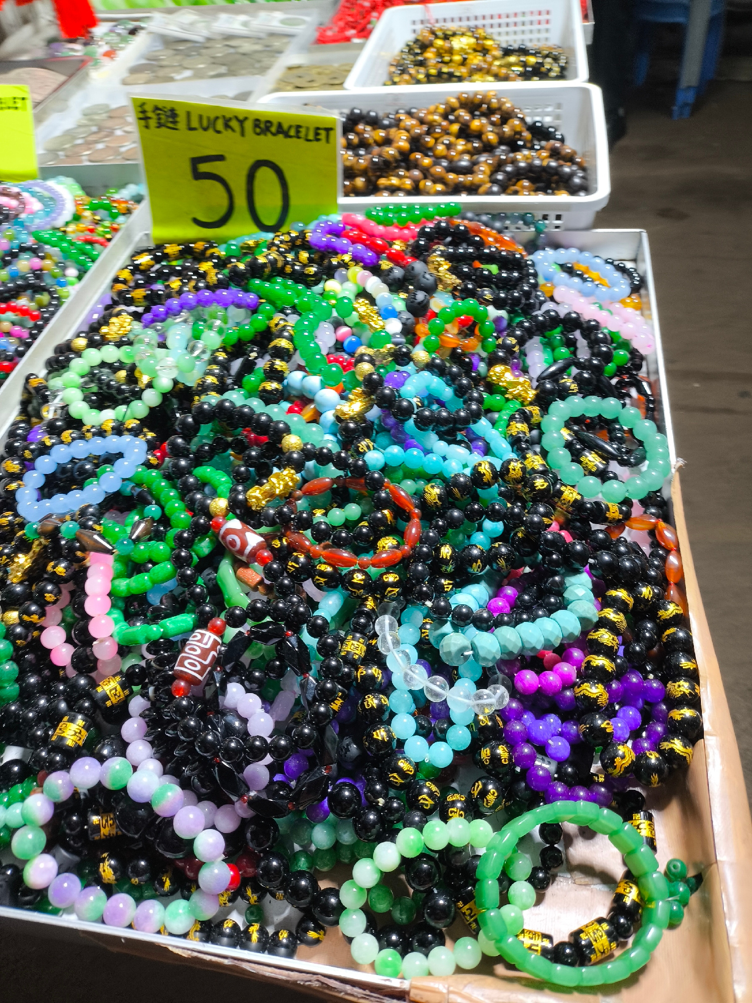 The image displays a close-up view of a market stall in Hong Kong, China, presenting a large collection of beaded bracelets for sale. Multiple shallow bins are overflowing with various elasticized bra…read more
