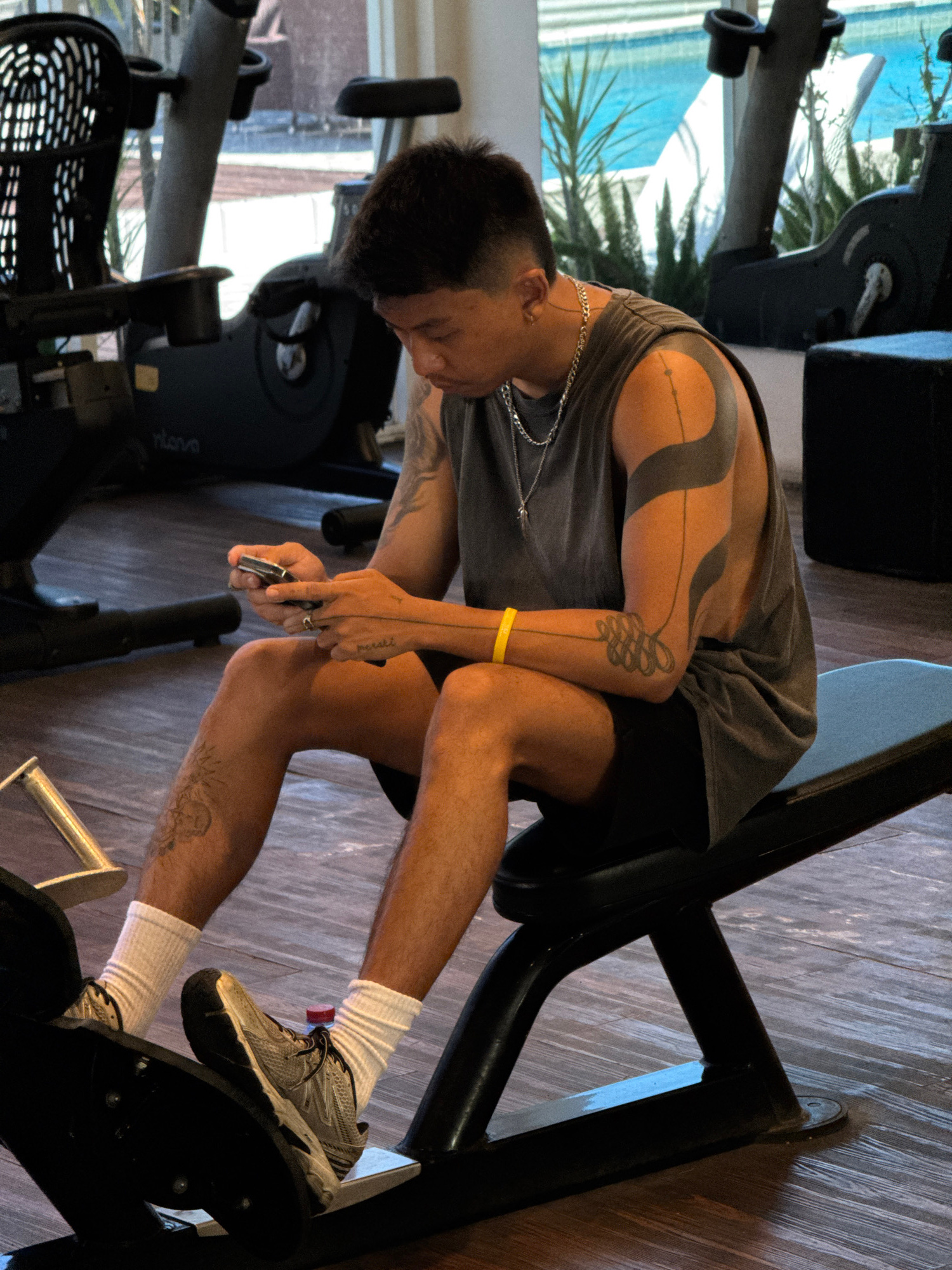 A person is sitting on a piece of exercise equipment inside what appears to be a gym. The person is wearing a grey tank top, black shorts, white socks, and athletic shoes. They have tattoos on their a…read more