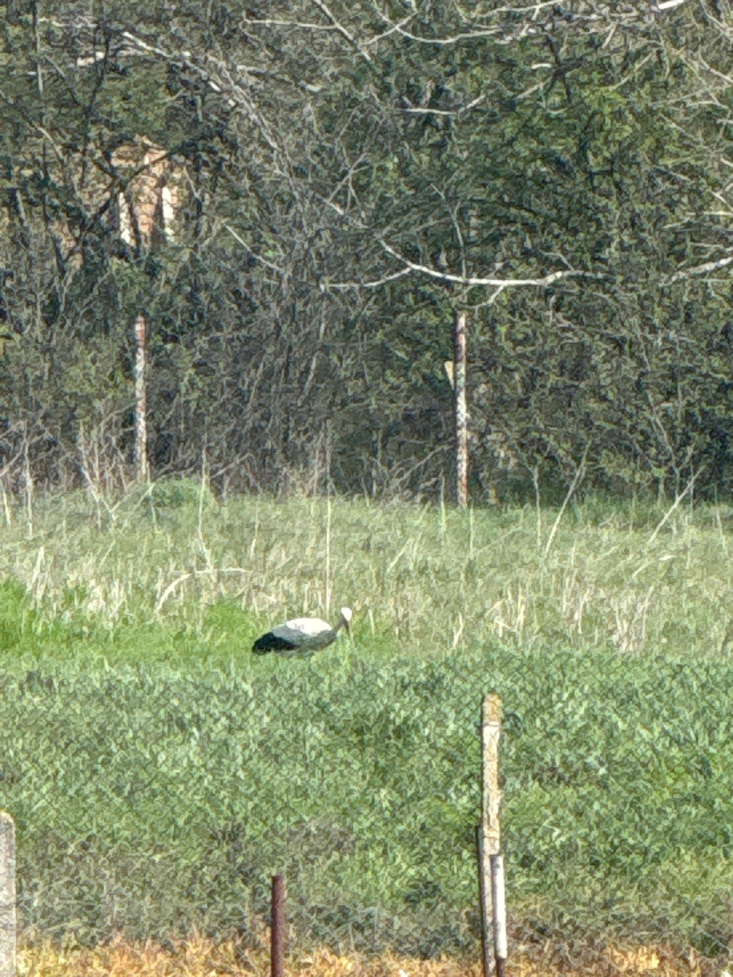 A bird stands in a grassy area next to a thicket of trees. Wooden fence posts delineate the edge of the grassy area. The location may be Cheshnegirovo, Bulgaria.