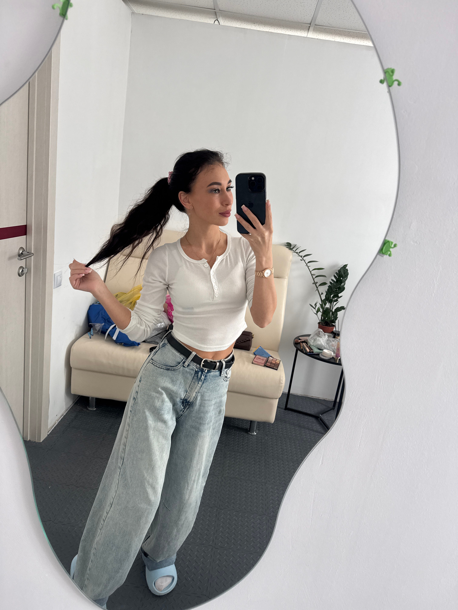 A woman is reflected in a large, oddly shaped mirror. The mirror's frame is decorated with small green frog figurines. The woman is holding a cell phone, presumably taking a selfie. She has long, dark…read more