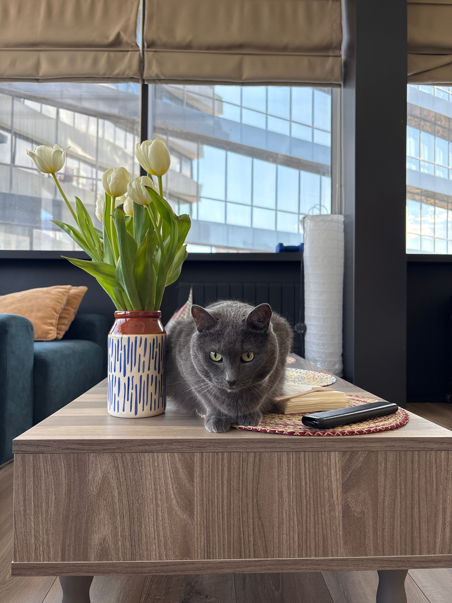 A gray cat is lying on a wooden table next to a vase of white tulips. A circular, multi-colored placemat sits on the table. A black object sits on top of the placemat. A window is in the background, r…read more