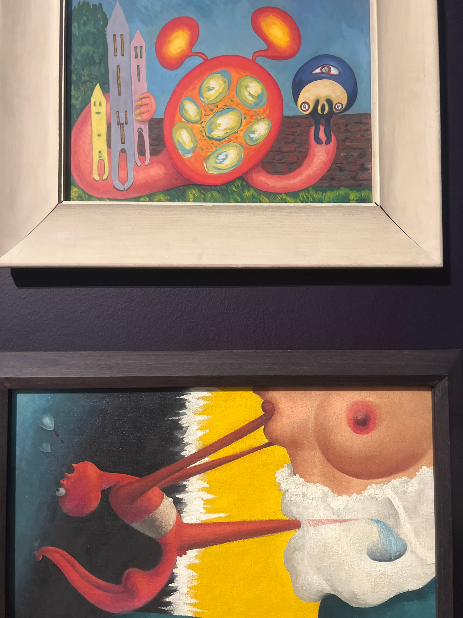 Two surreal paintings are displayed side-by-side on a dark purple wall in what appears to be an art gallery. The painting on the left, set in a light white frame, depicts a bizarre, anthropomorphic c…read more