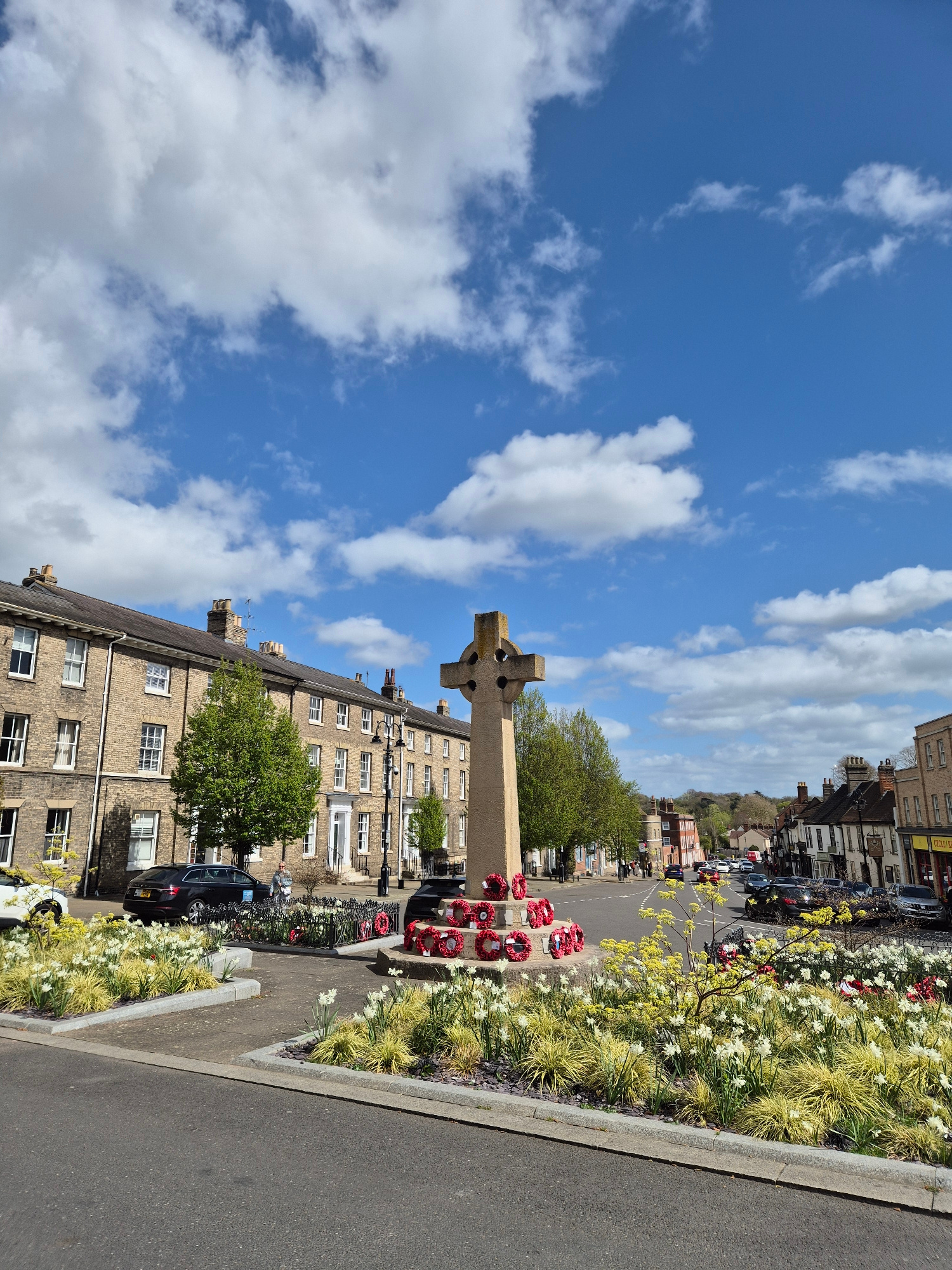 The image depicts a war memorial in Bury St Edmunds, West Suffolk, United Kingdom. The memorial is a Celtic cross, and it has several poppy wreaths at its base. It stands on a small green, surrounded by flowers and grass. Behind the memorial are buildings. The sky is blue and there are many clouds in the background. There are vehicles parked on the road in the distance. | Open Wire