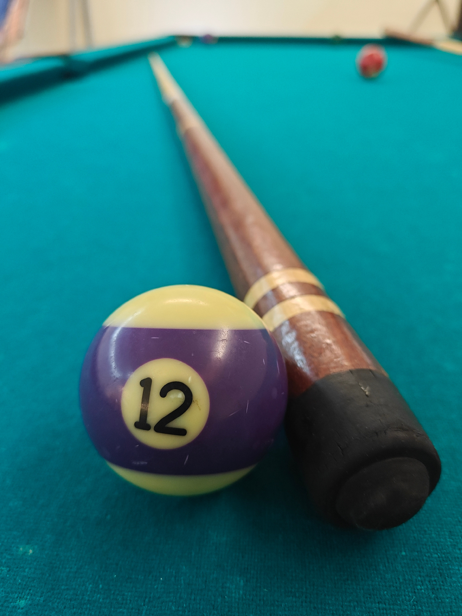 The image shows a billiard table with a turquoise felt surface. In the foreground, a billiard ball with the number 12 is positioned next to a pool cue. The ball is a combination of purple and yellow.…read more