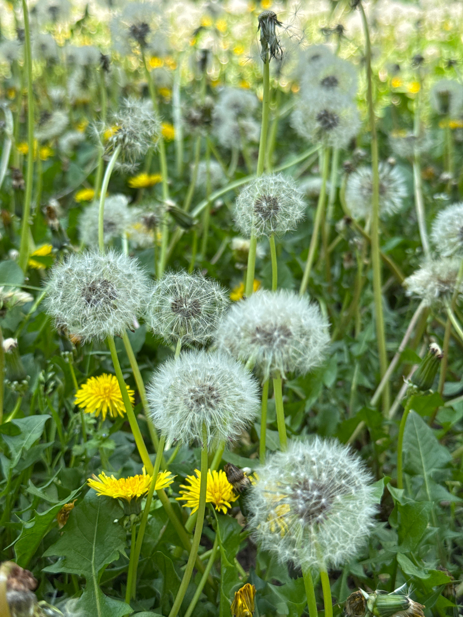 The image displays a field of dandelions in varying stages of their life cycle, including both yellow flowering dandelions and the seed heads known as puffballs. Lush green foliage surrounds the dande…read more