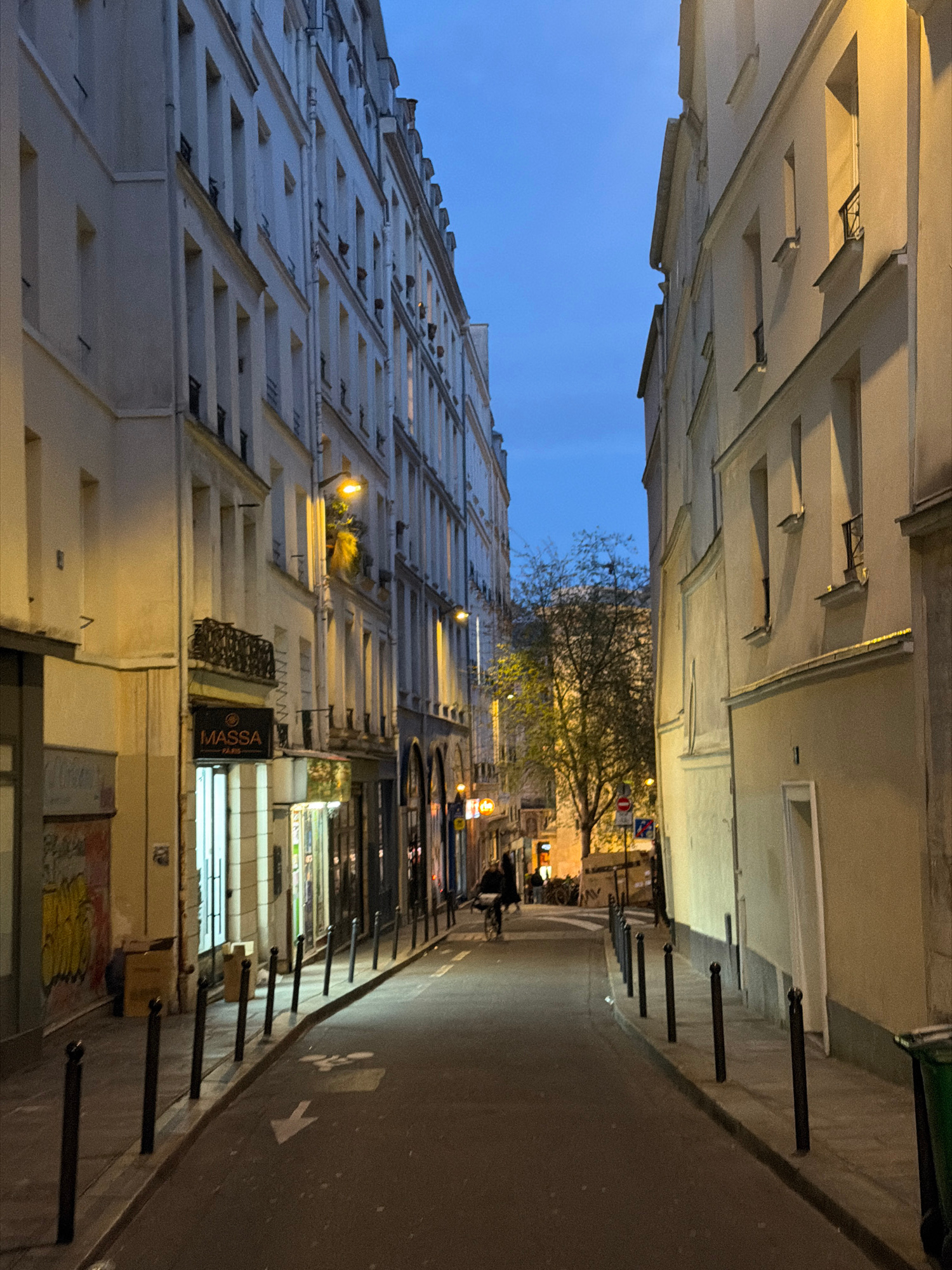 The image depicts a narrow urban street in Paris, France, observed at dusk or early night. Multi-story, light-colored buildings with numerous windows, typical of Parisian architecture, flank both side…read more