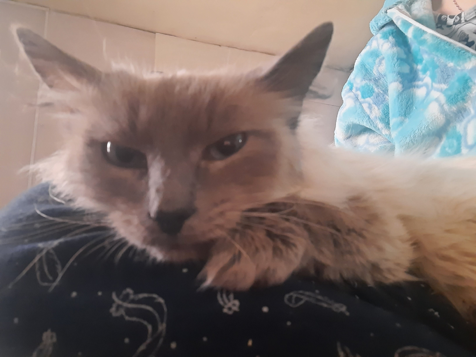 A cat rests on a person's lap. The cat has beige and brown fur, pointed ears, and is looking towards the camera. The person's lap is covered with dark blue pajamas with white constellation designs. An…read more